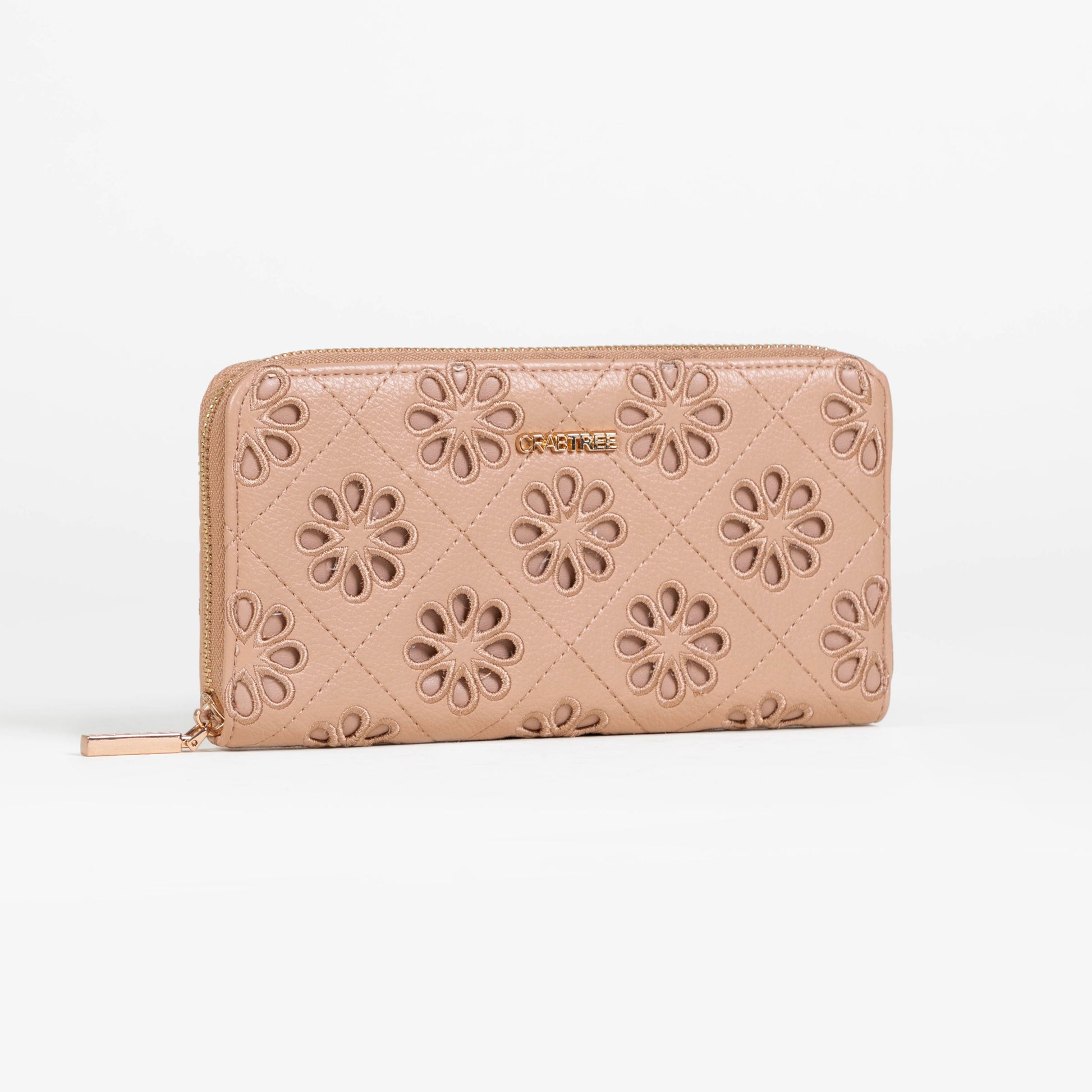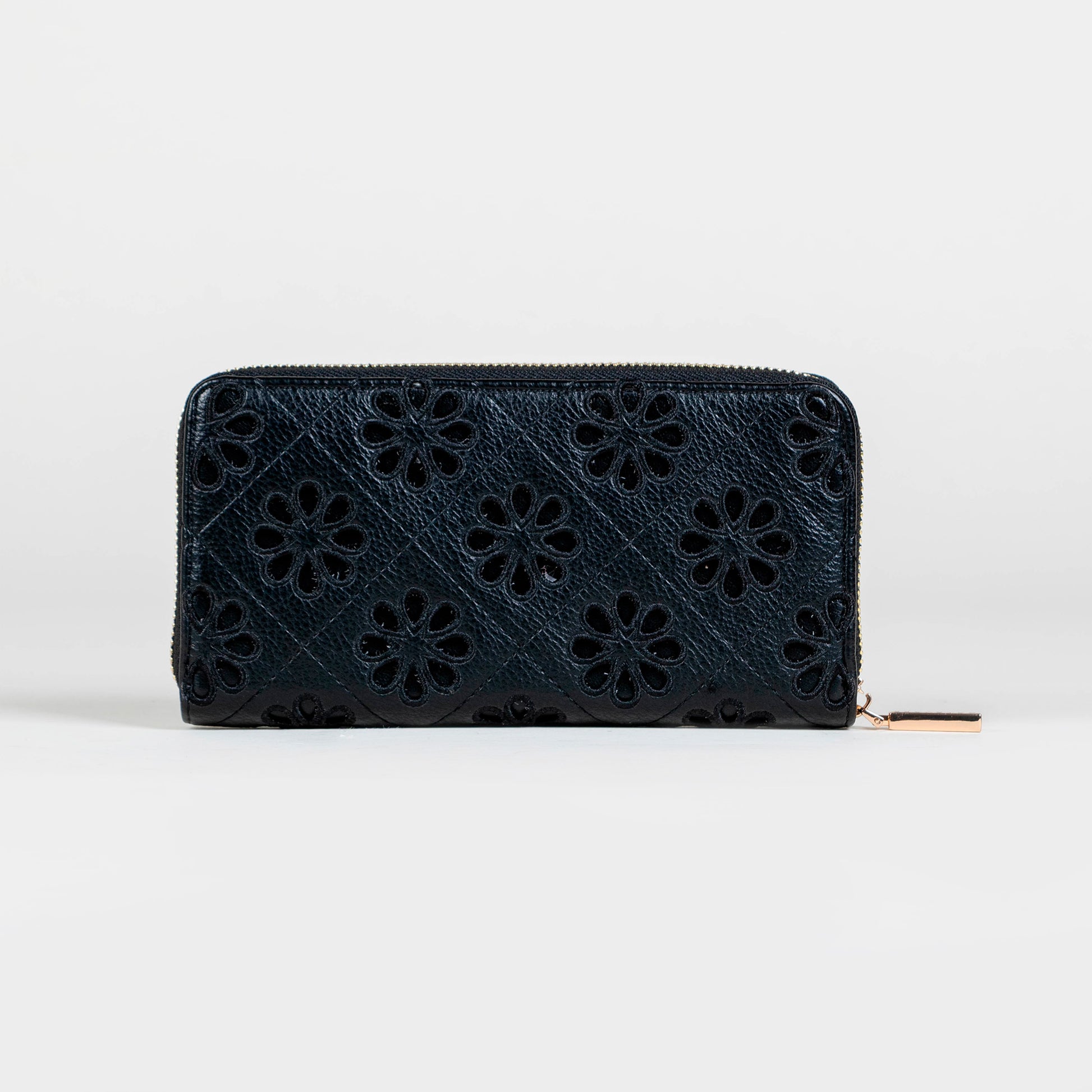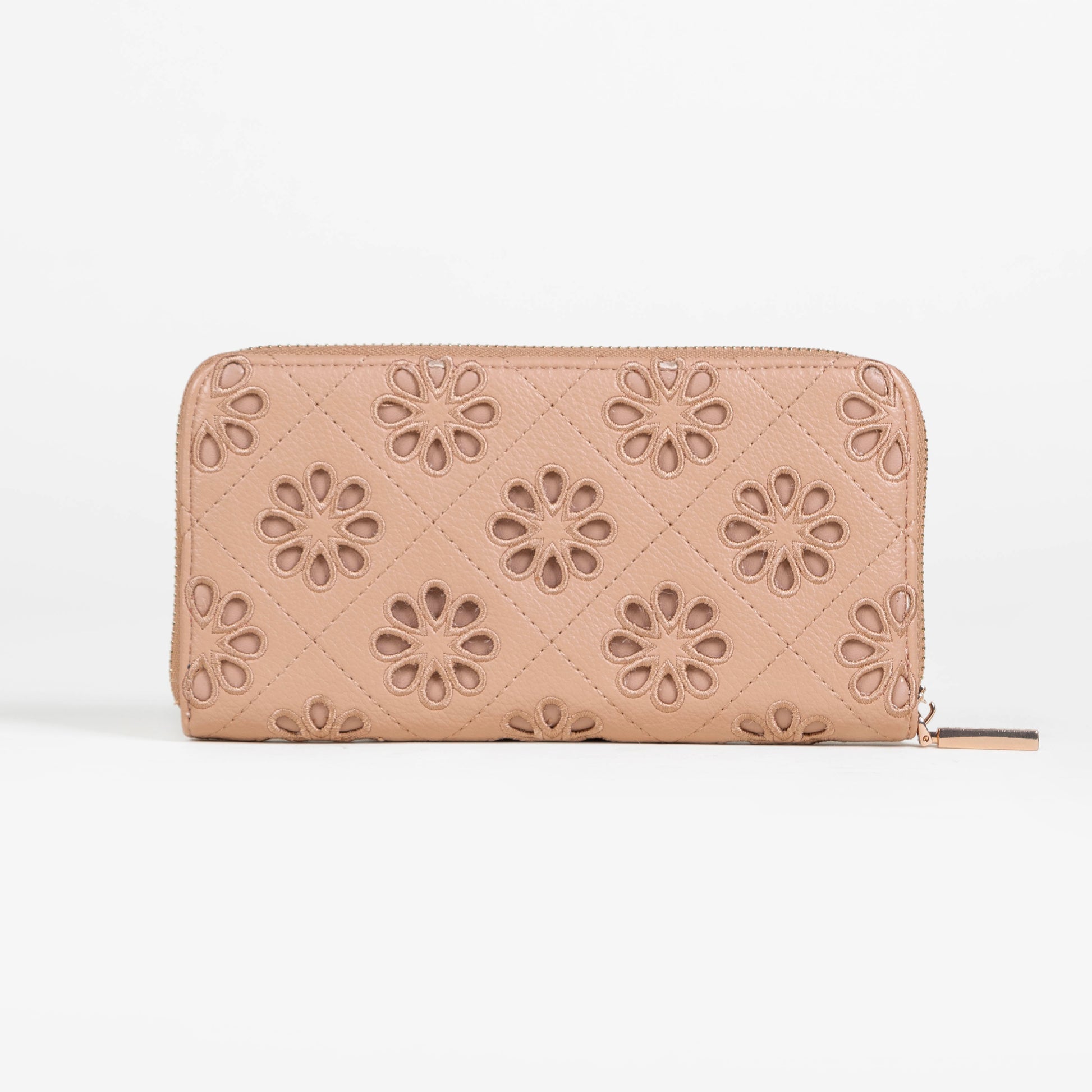 Cartera grande con textura de flor en la parte externa. Apertura de cierre y en la parte interna compartimento con cierre y para tarjetas.