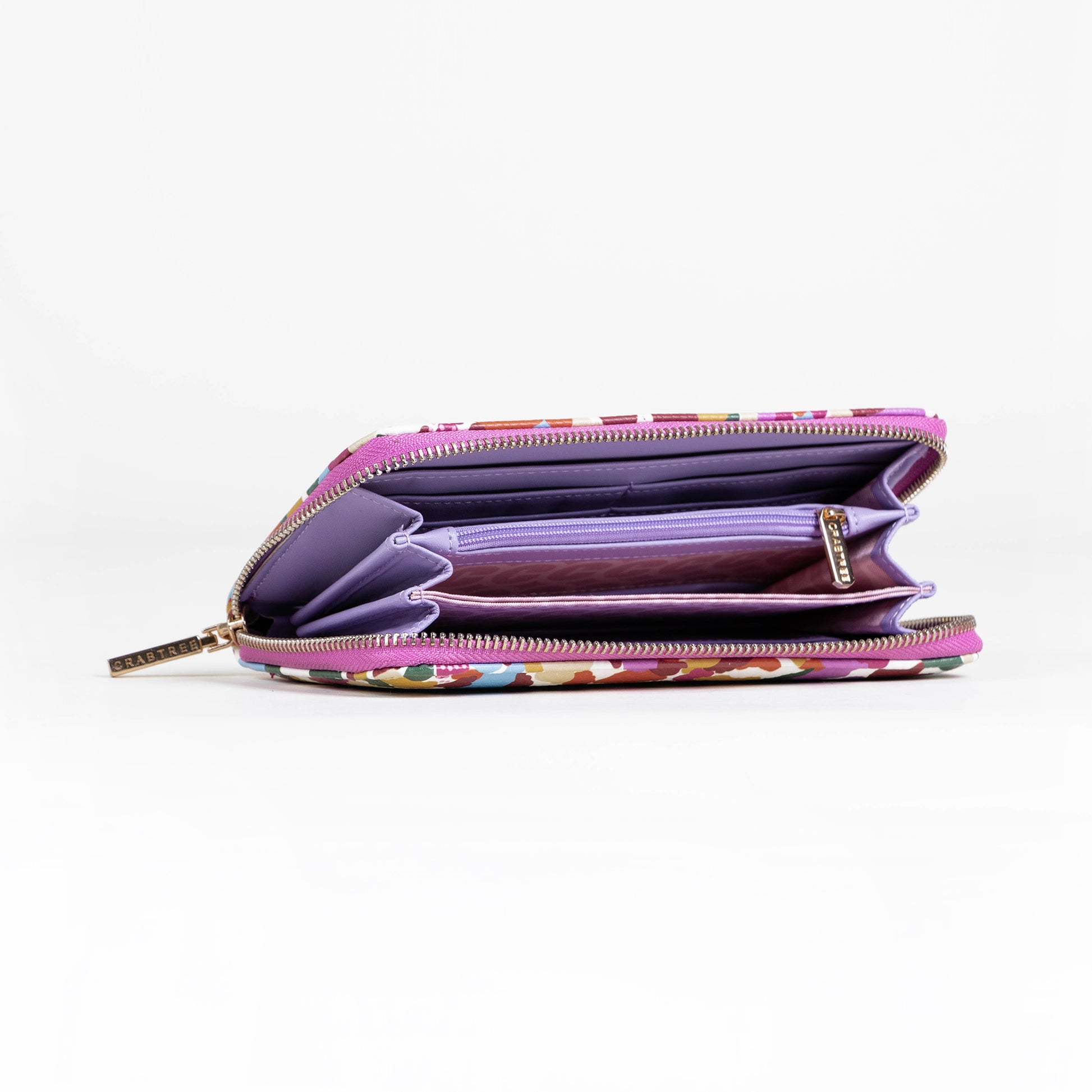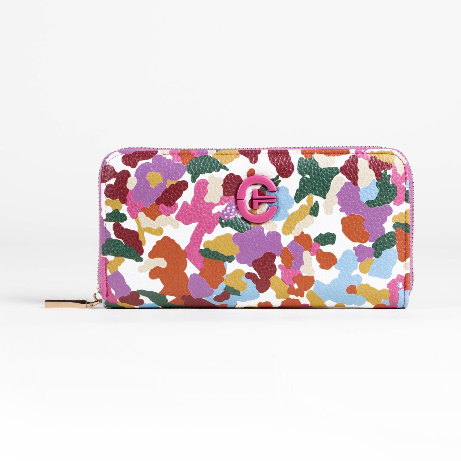 Cartera mediana de un cierre en la parte externa y uno pequeño en la parte interna. Dos compartimentos en los costados para tarjetas.
