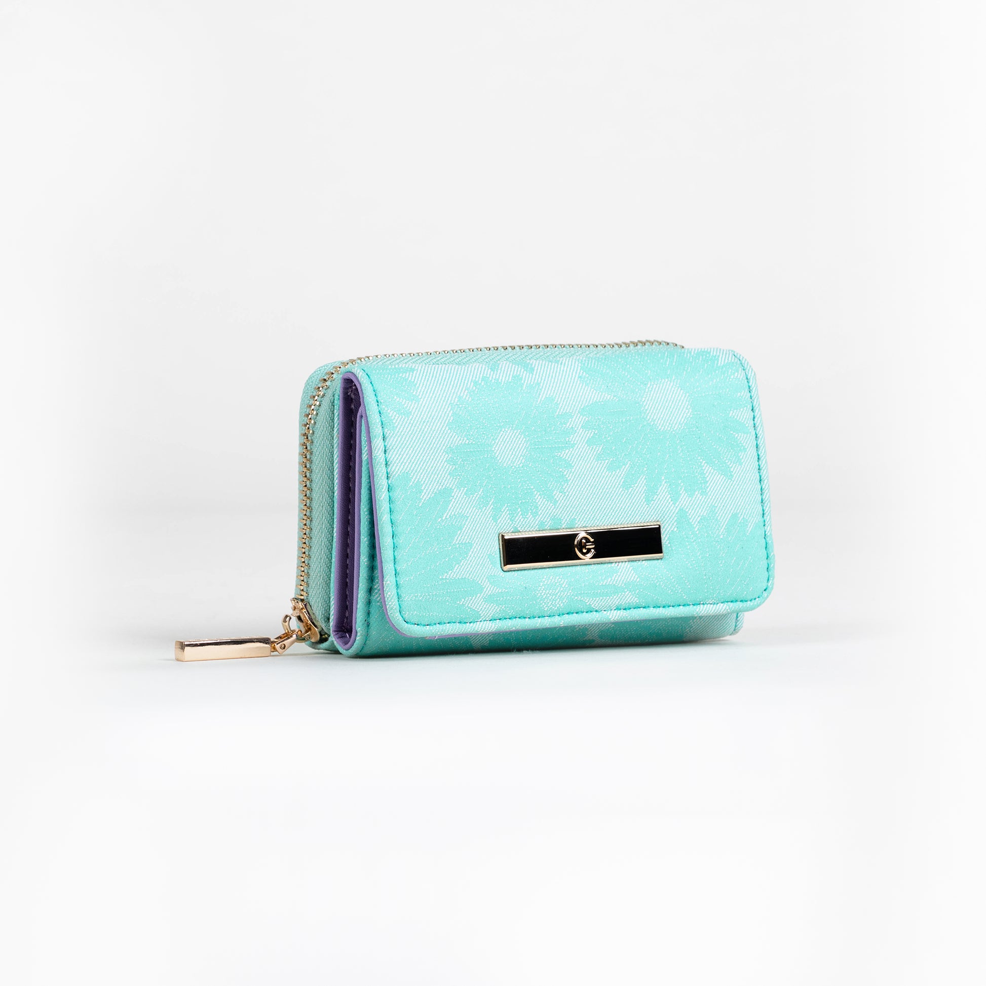 Cartera chica con broche y múltiples compartimentos para tarjetas y billetes. En la parte de afuera un cierre para monedas