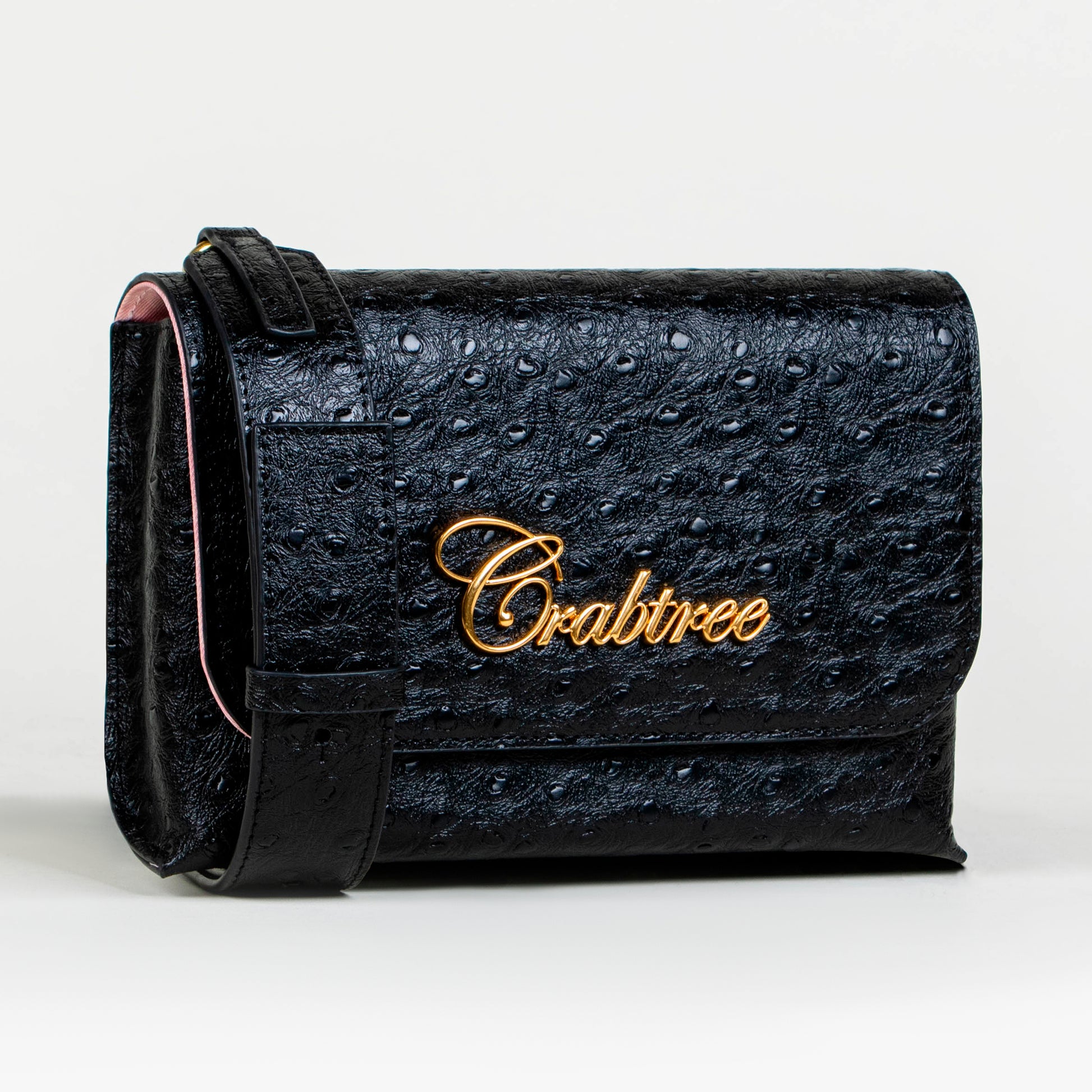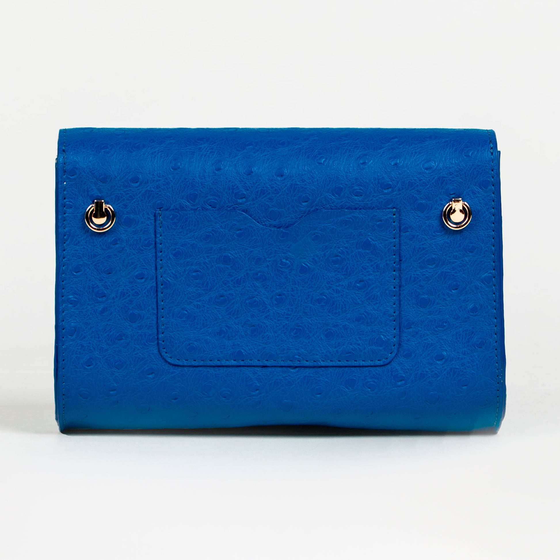 La superficie muestra una textura sutil que evoca la piel exótica, añadiendo profundidad sin saturar el diseño. Al frente, destaca el logotipo en tipografía cursiva en acabado metálico dorado, que contrasta con el color del bolso y le aporta un toque sofisticado.