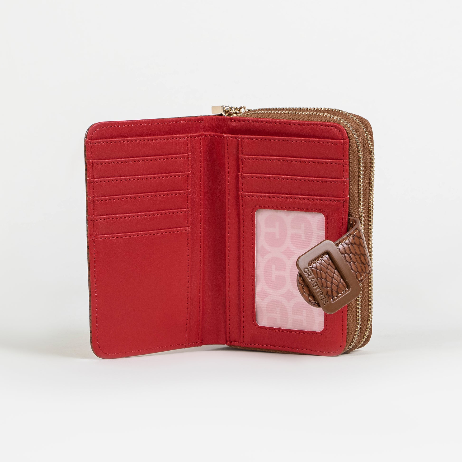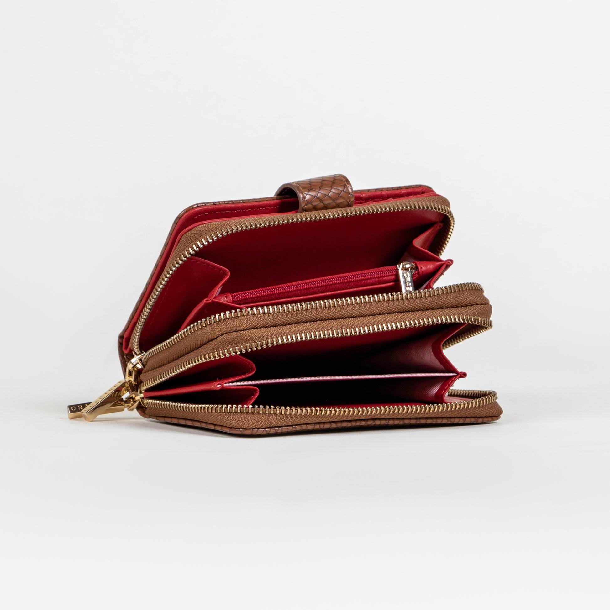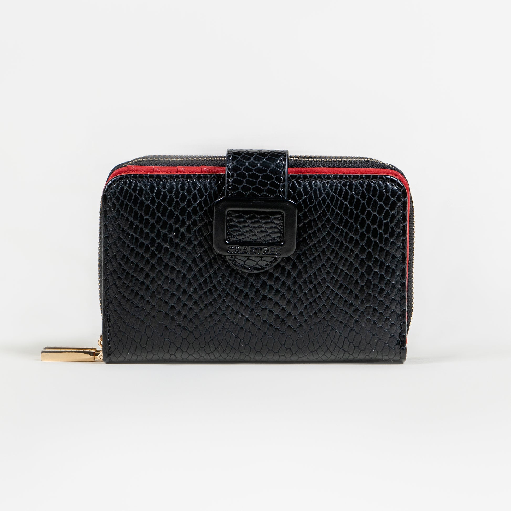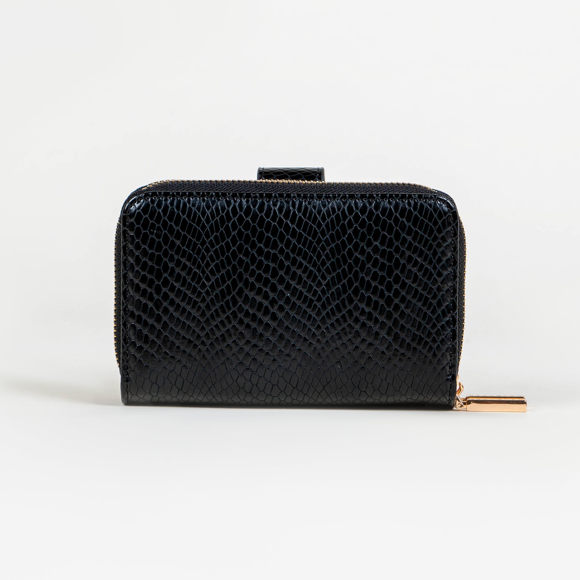 Cartera compacta con cierre perimetral, que destaca por su diseño elegante con un toque contemporáneo. Está elaborado en material sintético con textura tipo serpiente en color negro y tabaco, lo que le aporta un acabado sofisticado y atemporal.