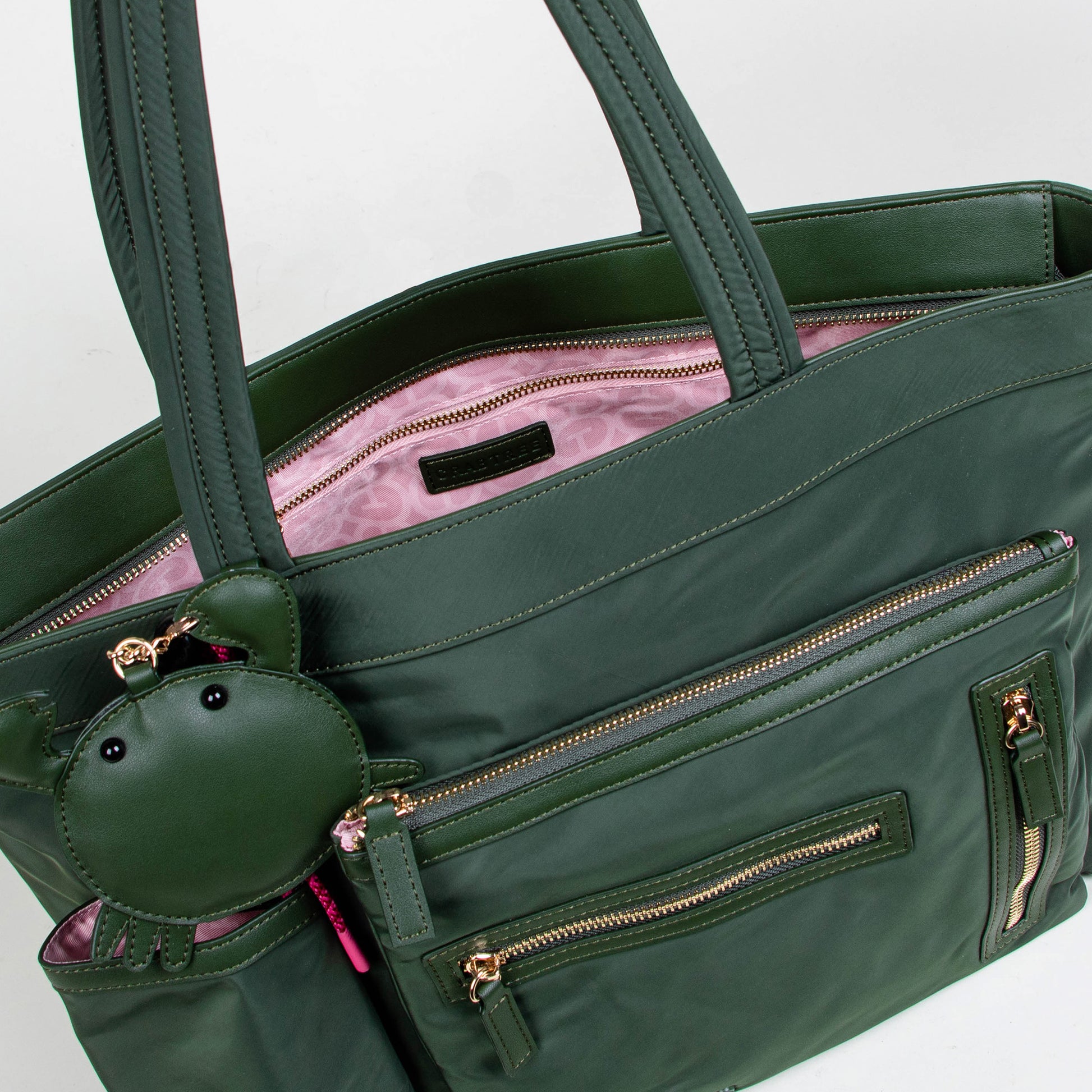 Disfruta de la elegancia y exclusividad con nuestro bolso TOTE. Hecho de nylon resistente, cuenta con un bolsillo interno. En el exterior cuenta con un bolsillo muy amplio que tiene tres compartimentos tener todo organizado. También cuenta con un porta termos para la botella de agua. El forro en contraste agrega un toque de sofisticación. Cuenta con un bolsillo principal con cierre. Cuenta con un charm de cangrejo para darle un estilo más divertido.