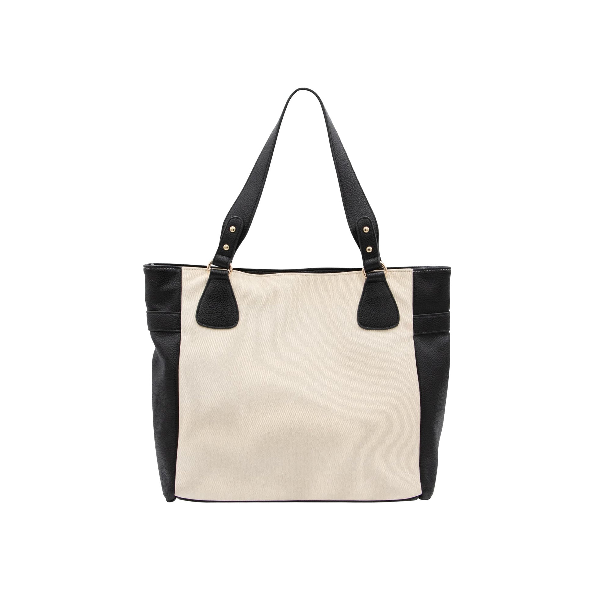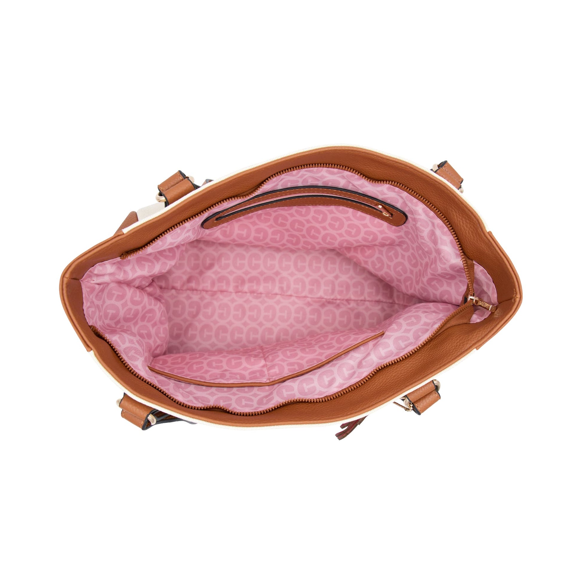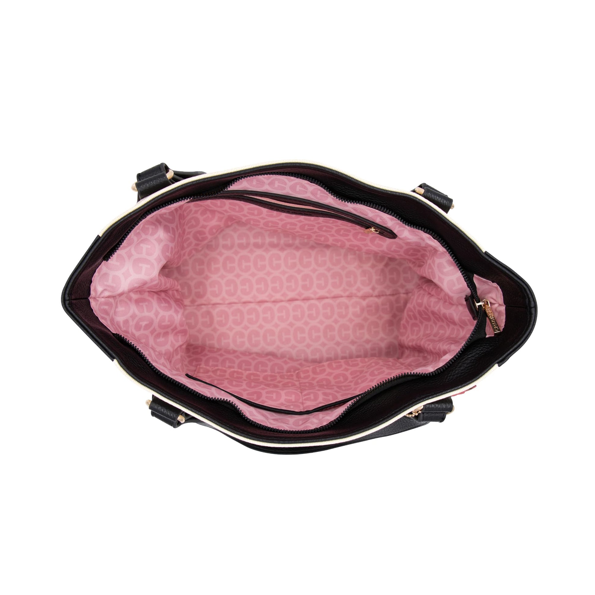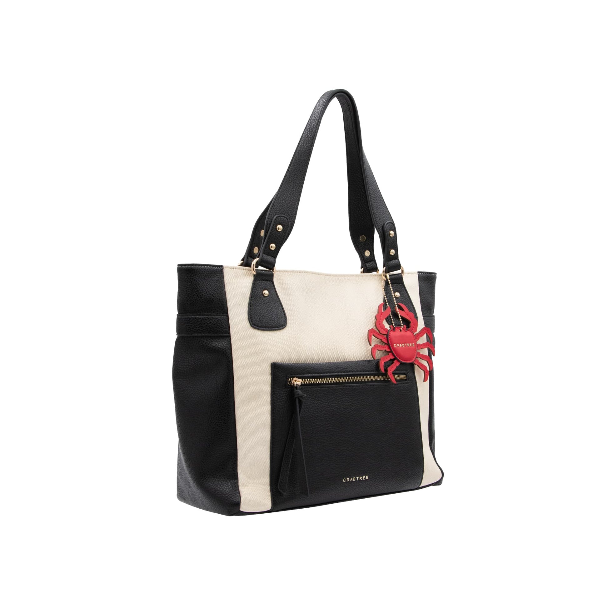 Bolso tote de diseño elegante, con bolsillo interno y externo con cierre. Destaca por su charm decorativo en forma de cangrejo y las asas adornadas con remaches.