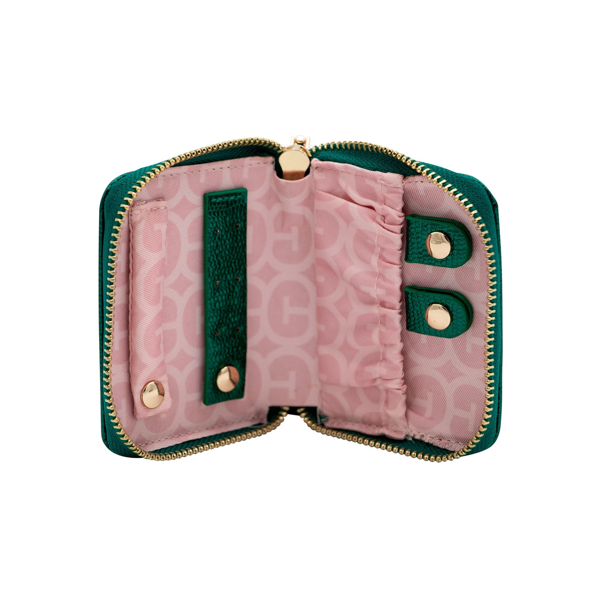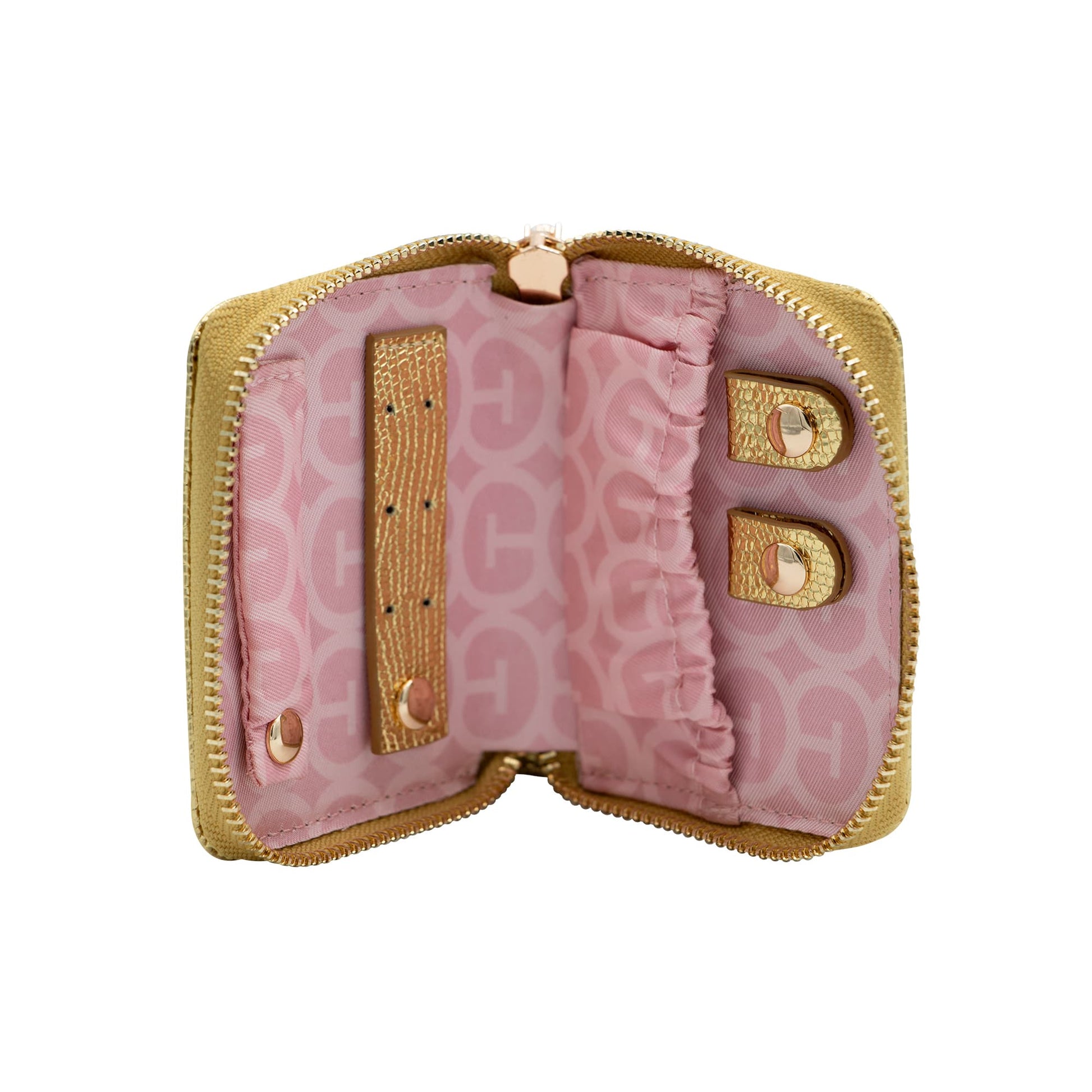 Pequeño joyero con compartimentos específicamente diseñados para collares, aretes y pulseras. Con un elegante diseño metálico y un cierre metálico seguro, mantiene tus joyas organizadas y protegidas.
