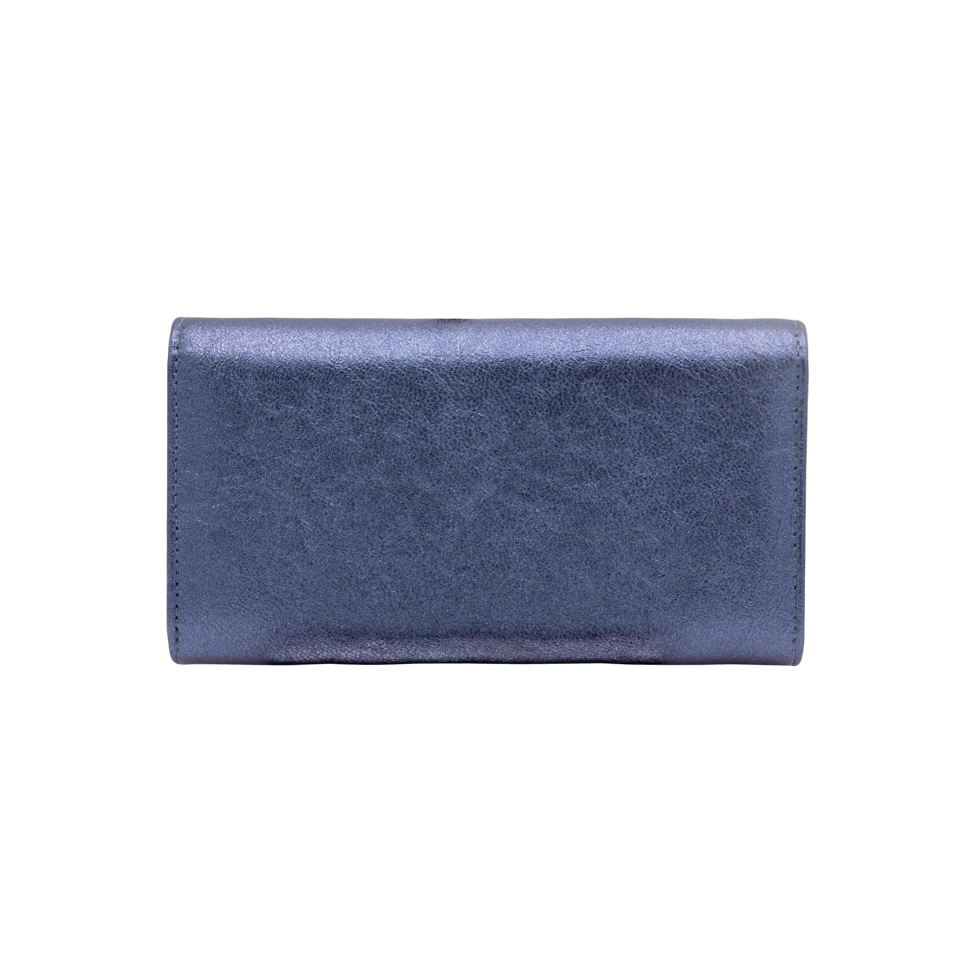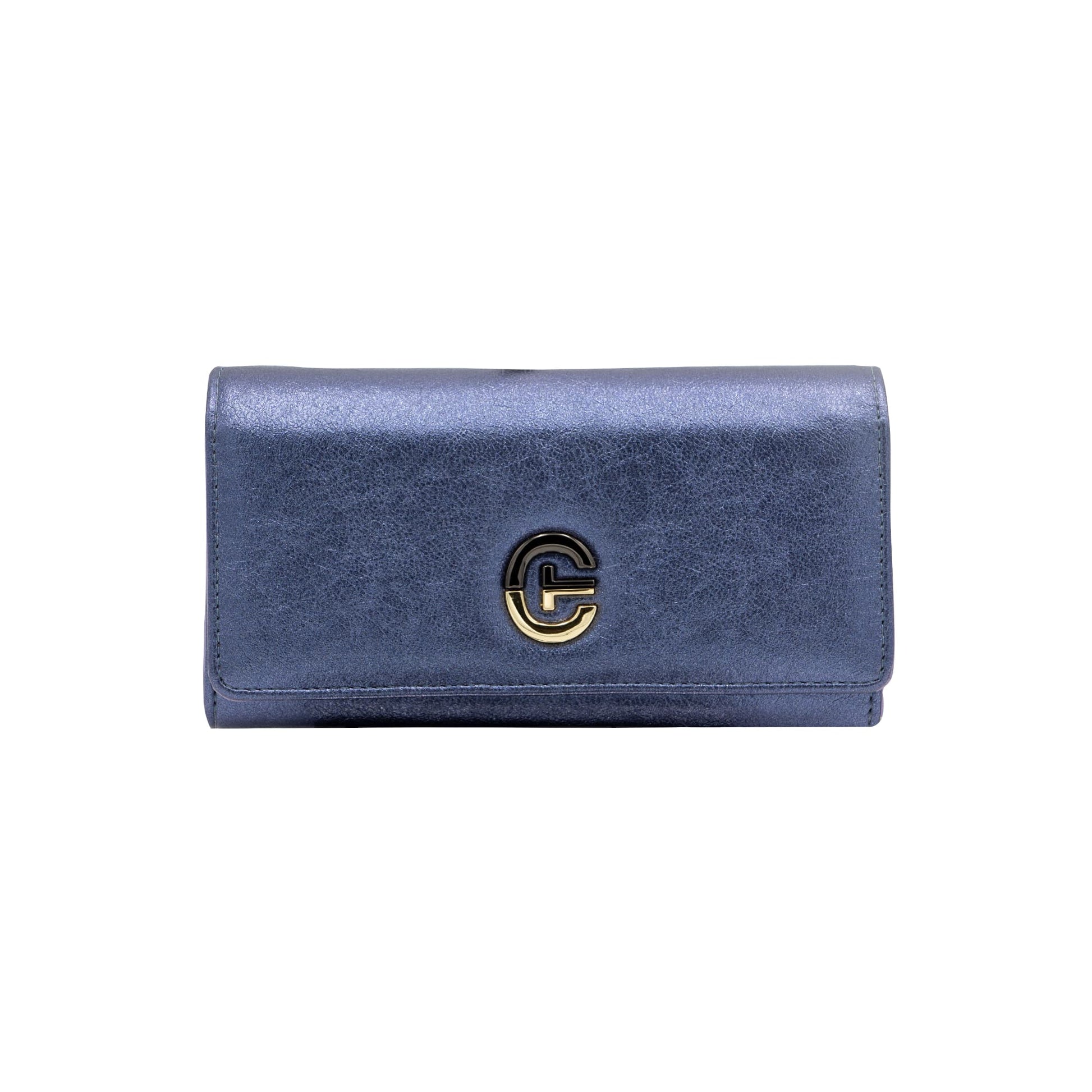 Cartera plegable con un sofisticado diseño metálico. Cuenta con compartimentos para tarjetas y un elegante isotipo metálico que aporta un toque distintivo. Ideal para quienes buscan un accesorio práctico y con estilo