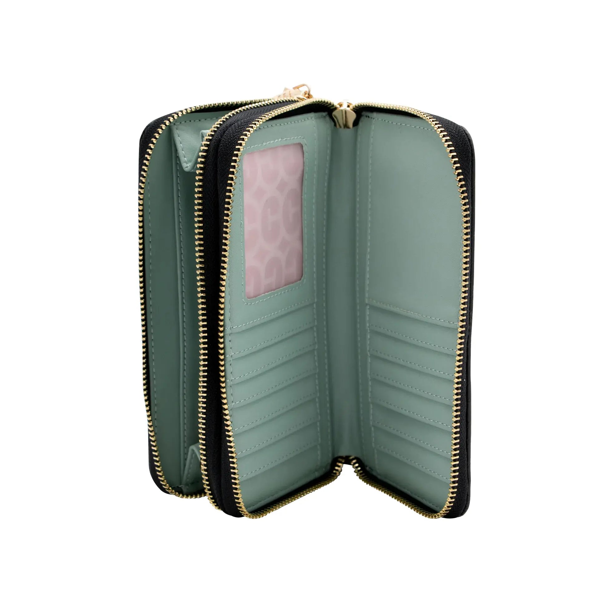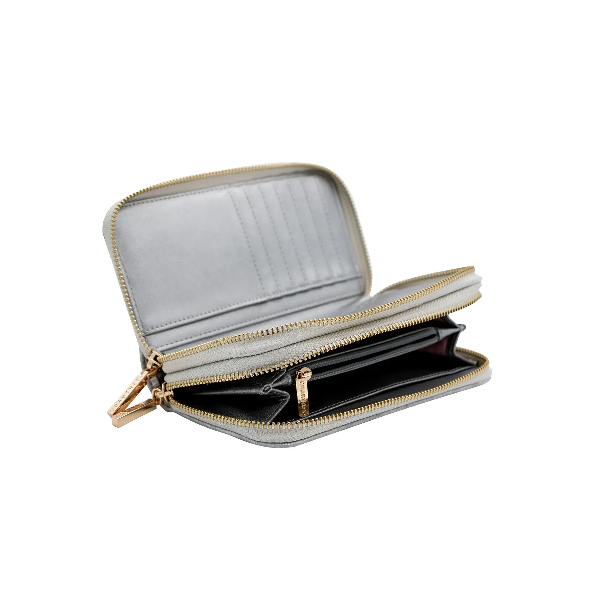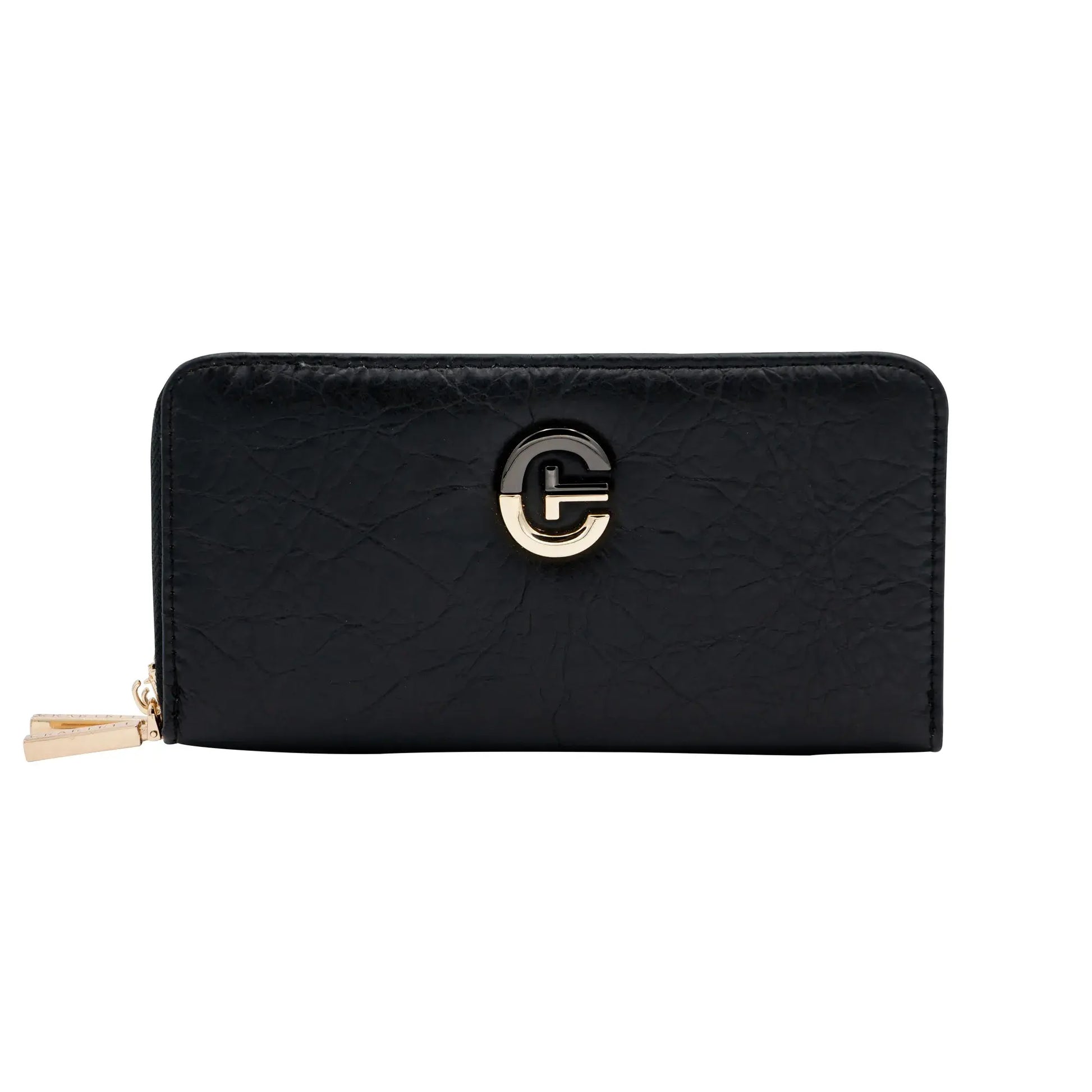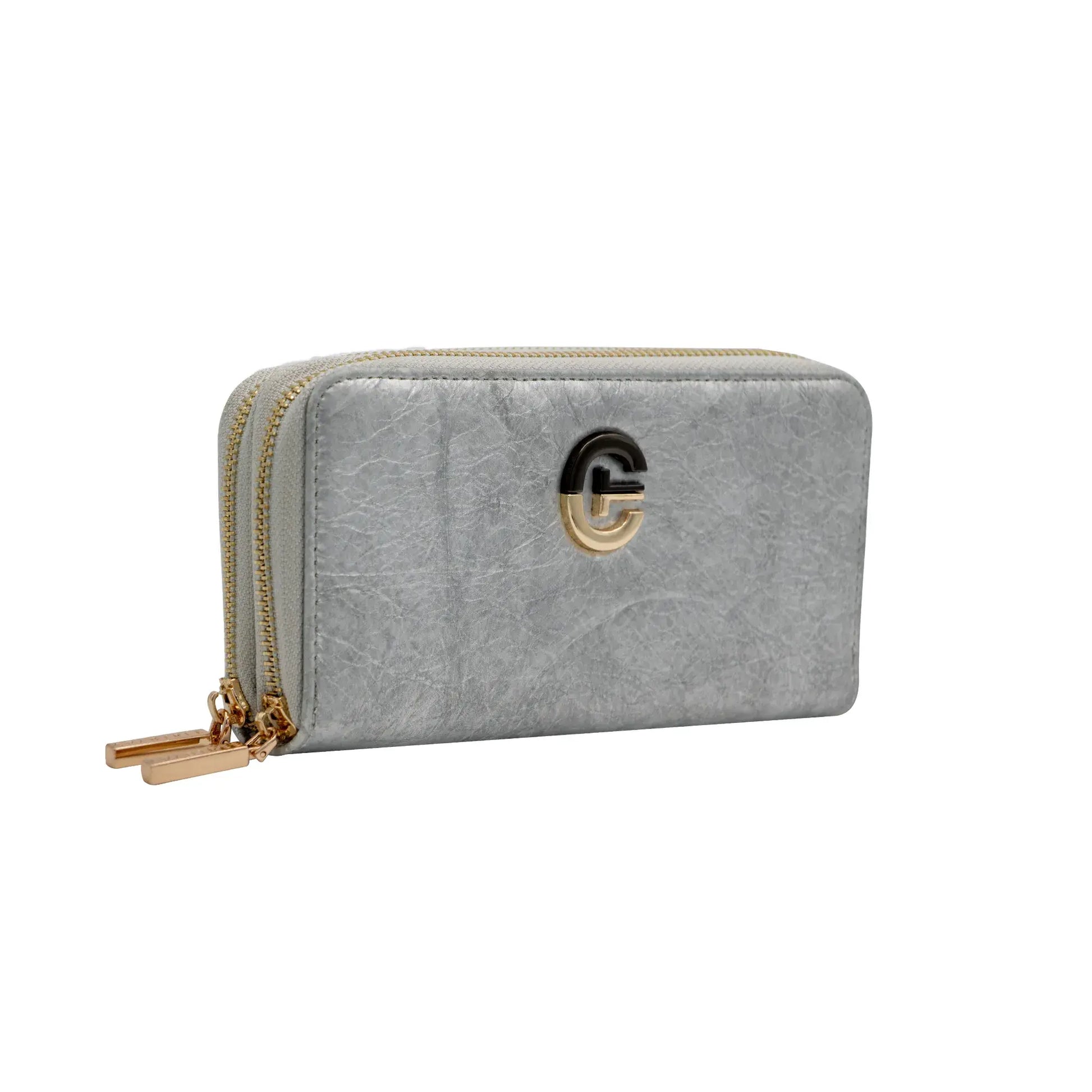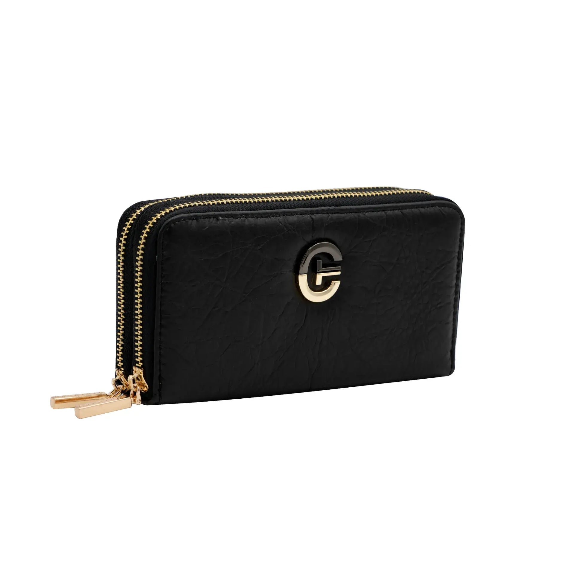 Cartera de doble cierre con un elegante isotipo metálico. Diseñada con compartimentos para tarjetas y un compartimento adicional con cierre, combina estilo y practicidad en cada detalle.
