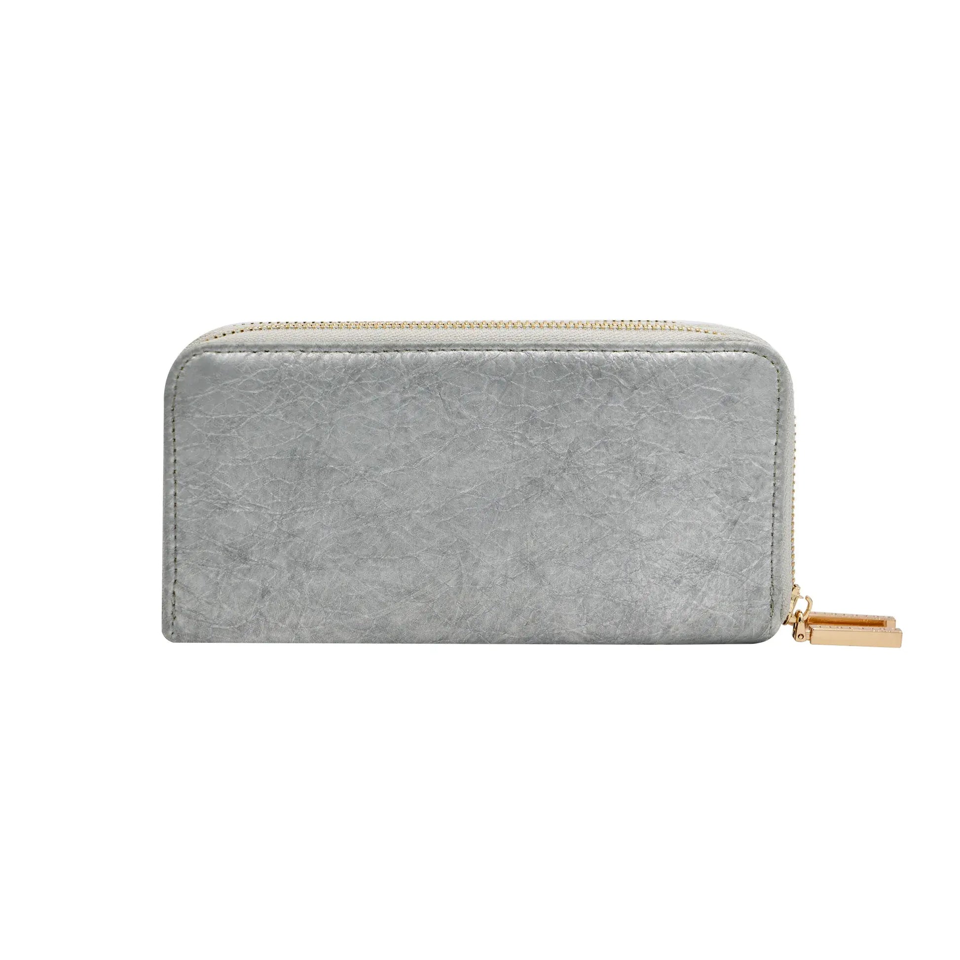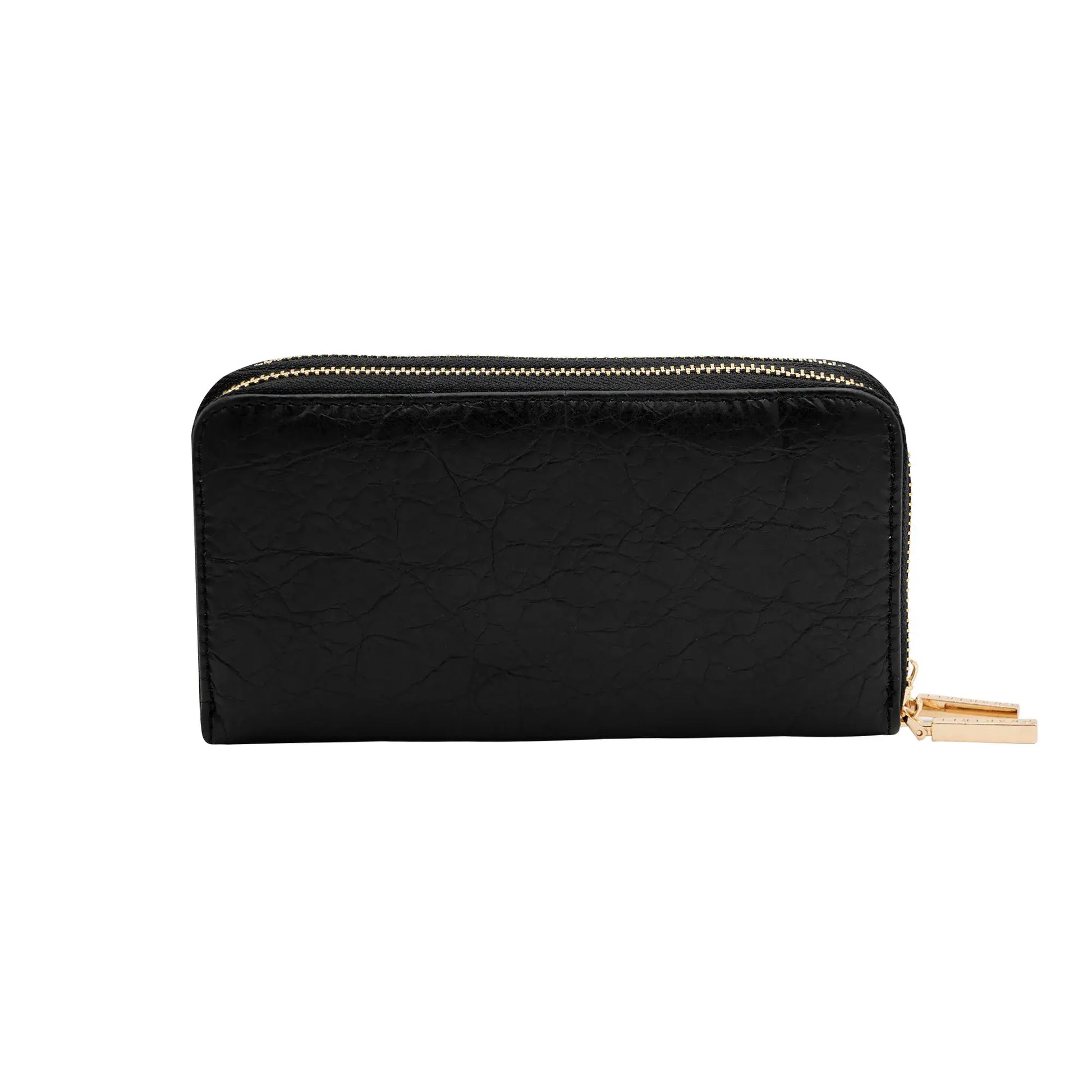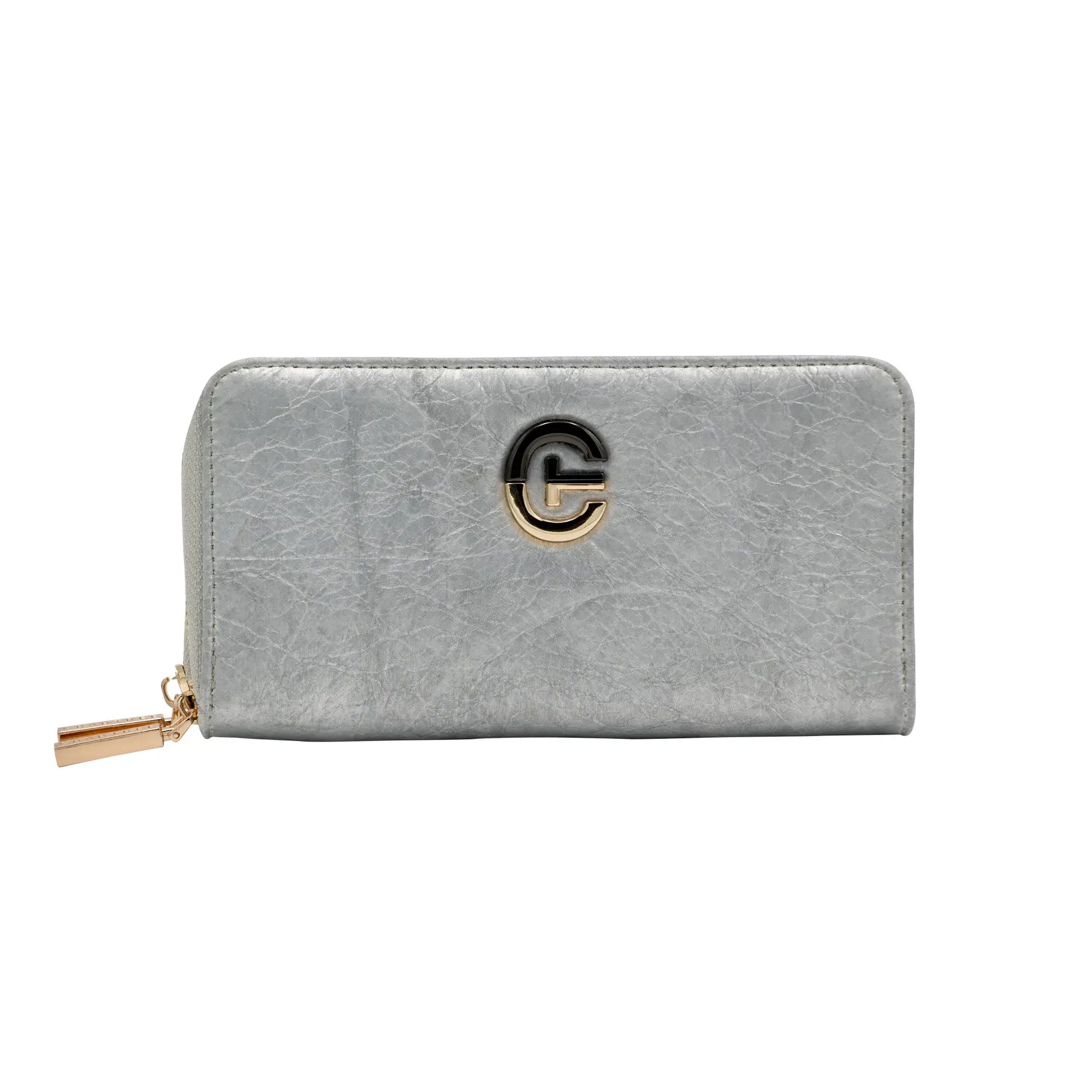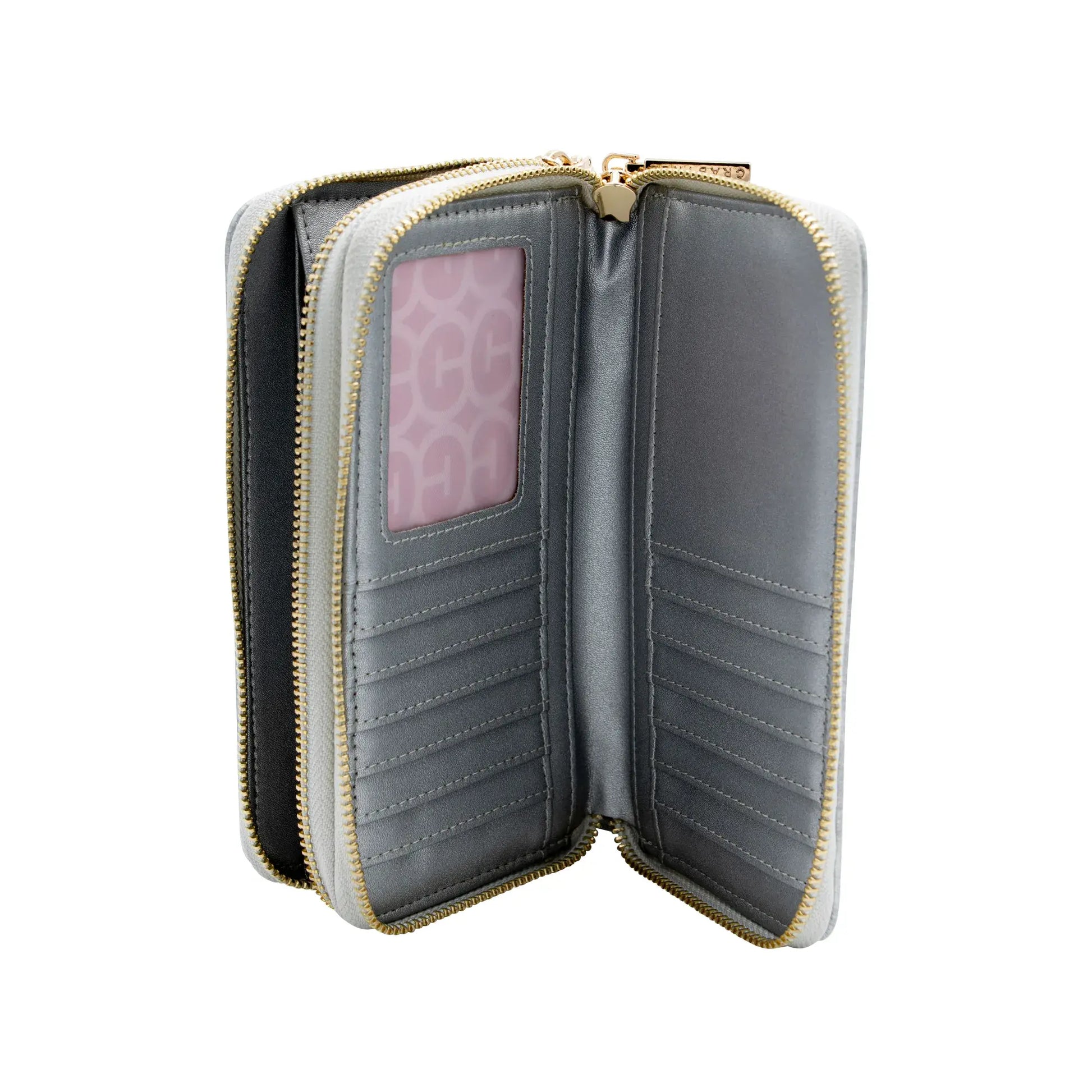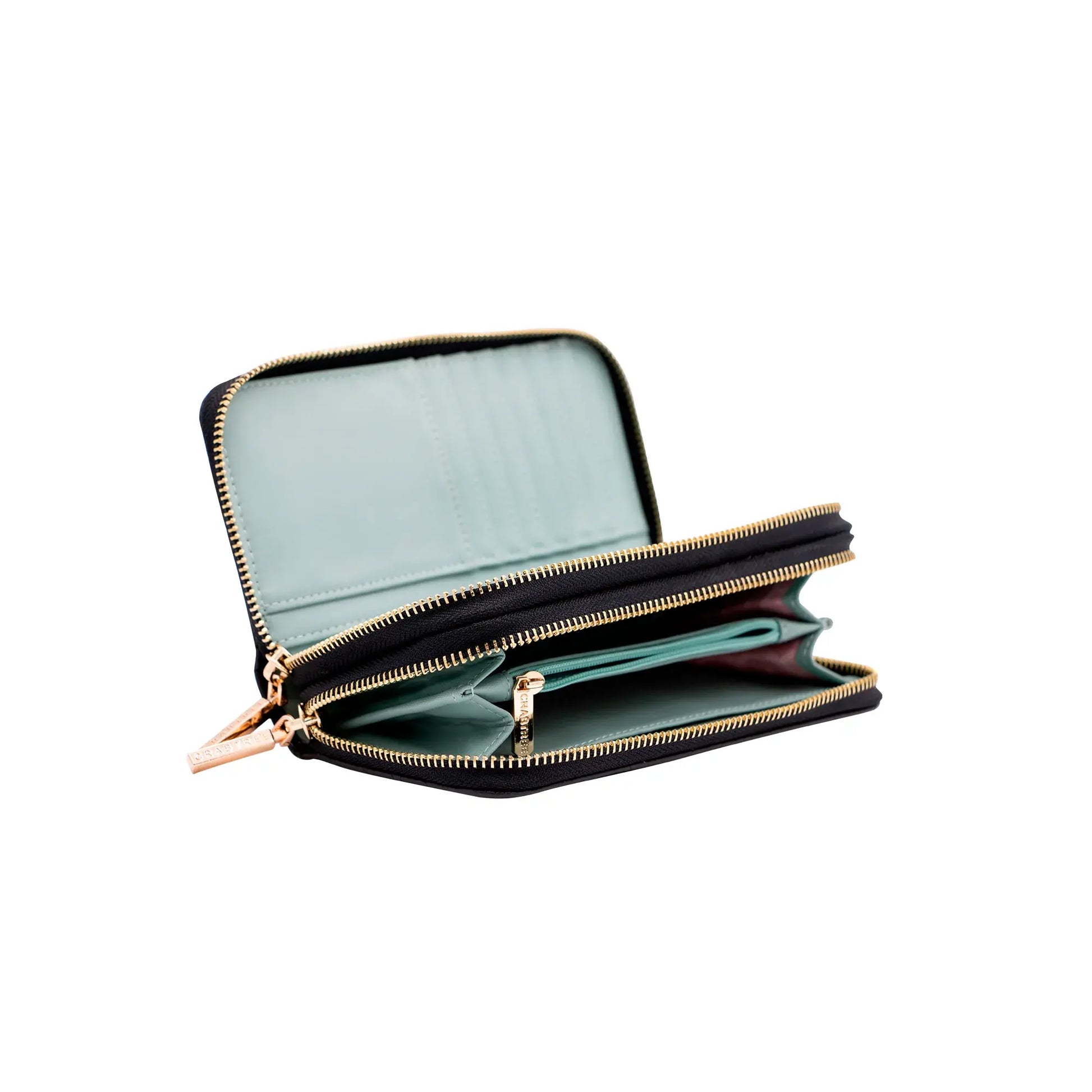 Cartera de doble cierre con un elegante isotipo metálico. Diseñada con compartimentos para tarjetas y un compartimento adicional con cierre, combina estilo y practicidad en cada detalle.