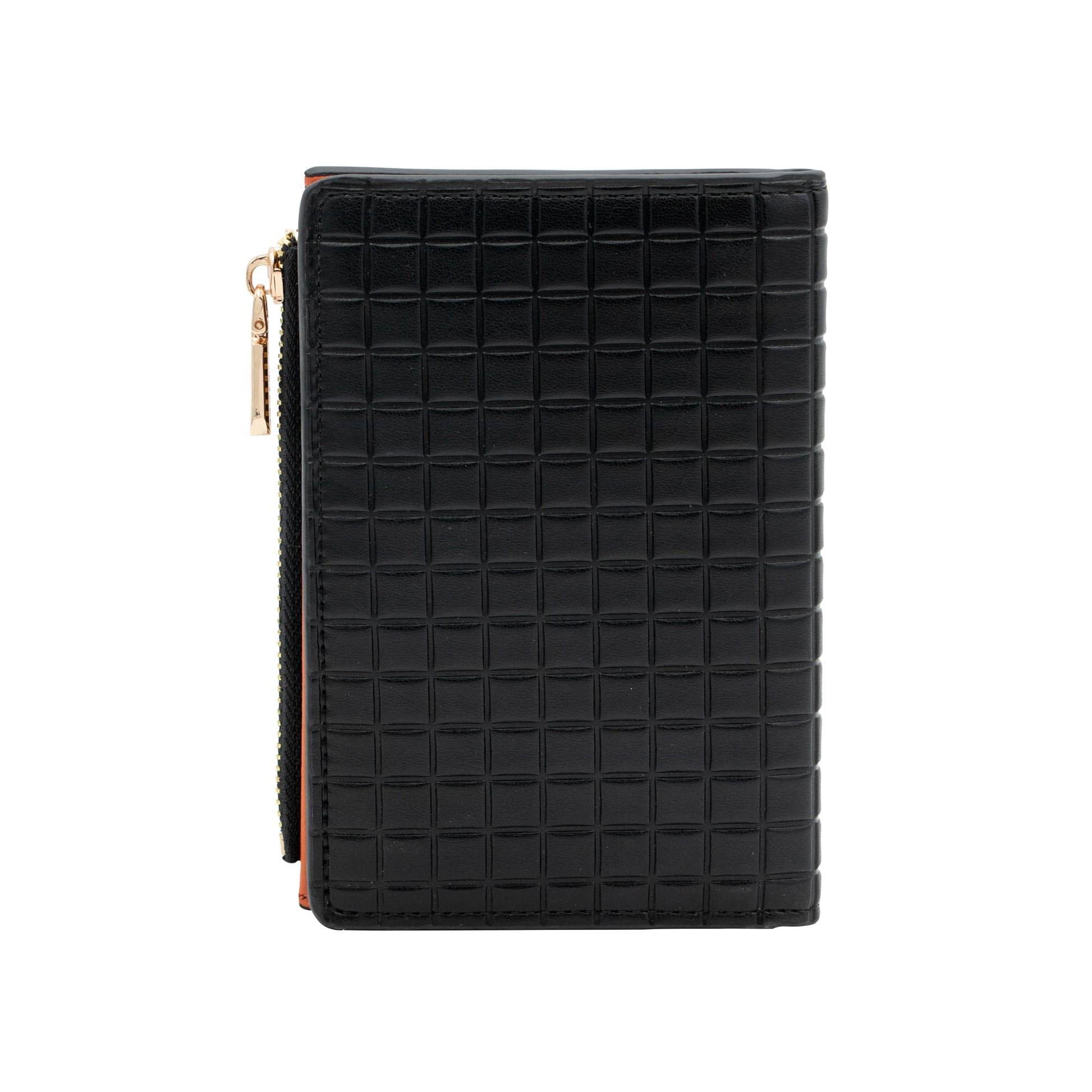 Cartera tarjetero con elegante textura táctil de cuadros y un diseño tipo libro que se abre con un seguro broche de presión para mantener sus pertenencias protegidas. Cuenta con compartimentos especiales para tarjetas y un amplio espacio para billetes. En el exterior, incorpora un práctico bolsillo con cierre, ideal para guardar monedas de forma segura. Su diseño sofisticado y funcional la convierte en el accesorio perfecto para quienes buscan estilo y organización.