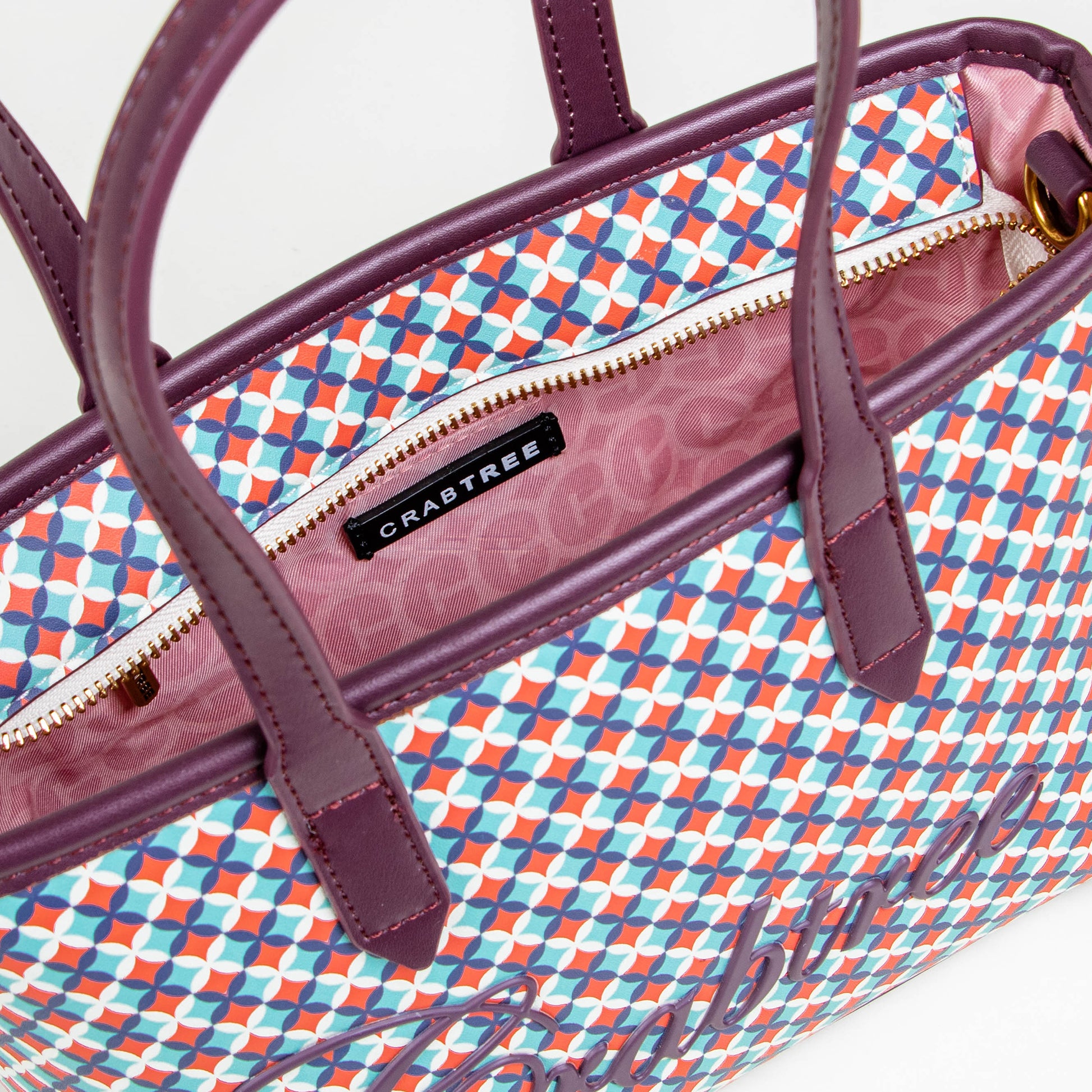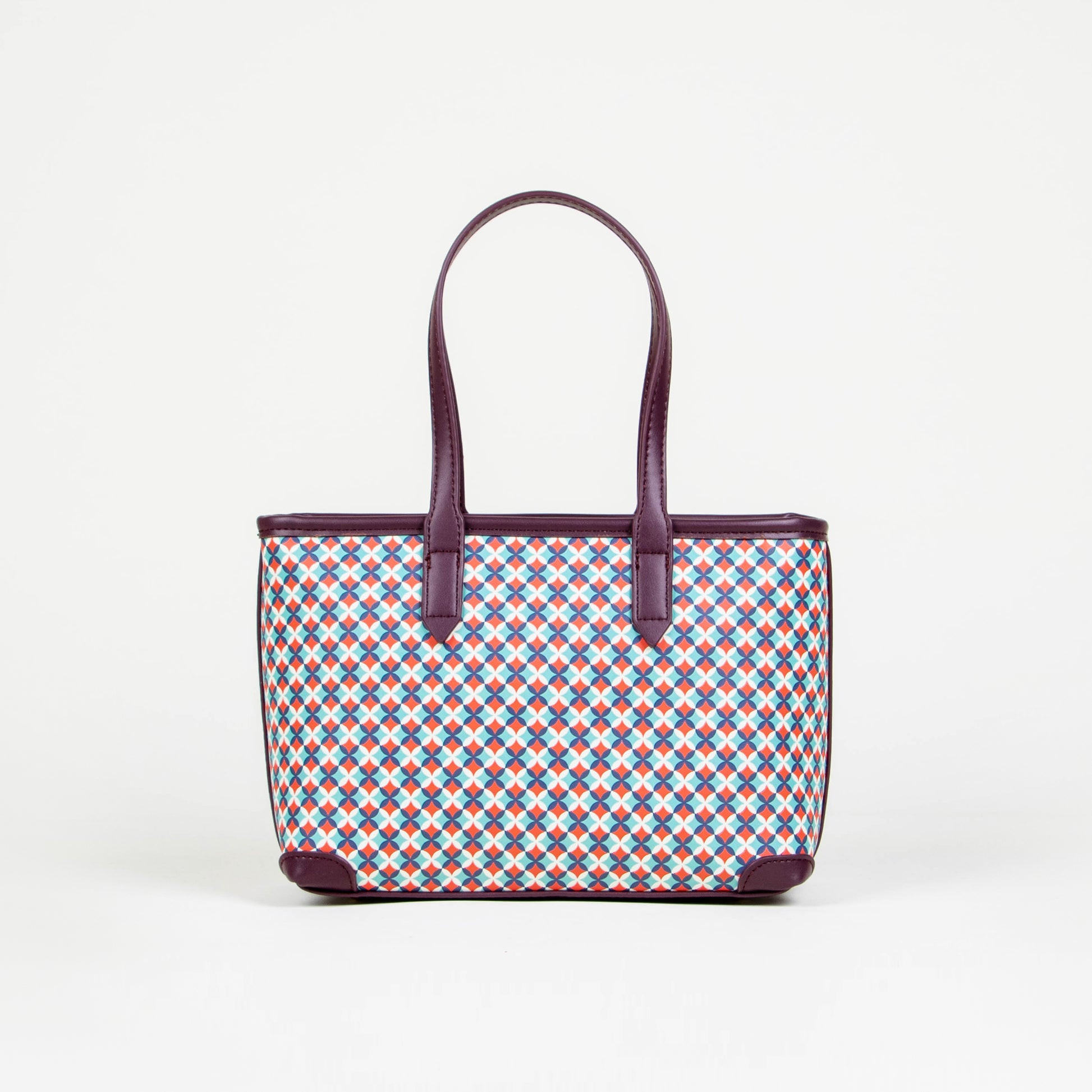Tote compacto con un diseño estructurado y muy versátil. Está confeccionado en un material con estampado geométrico repetitivo en tonos cálidos y verde, lo que le aporta un estilo moderno y dinámico.