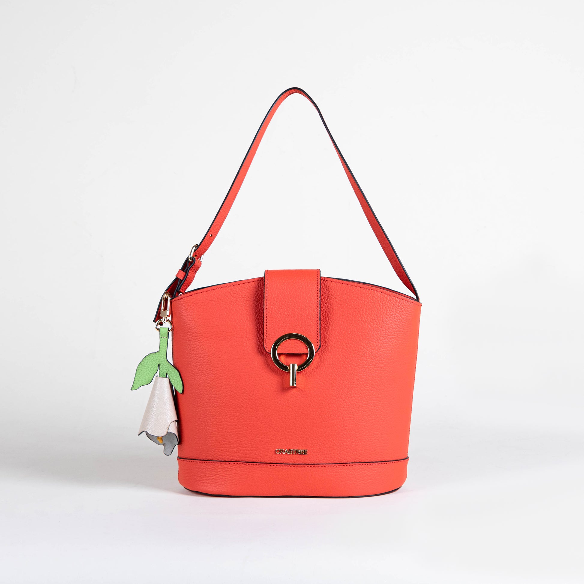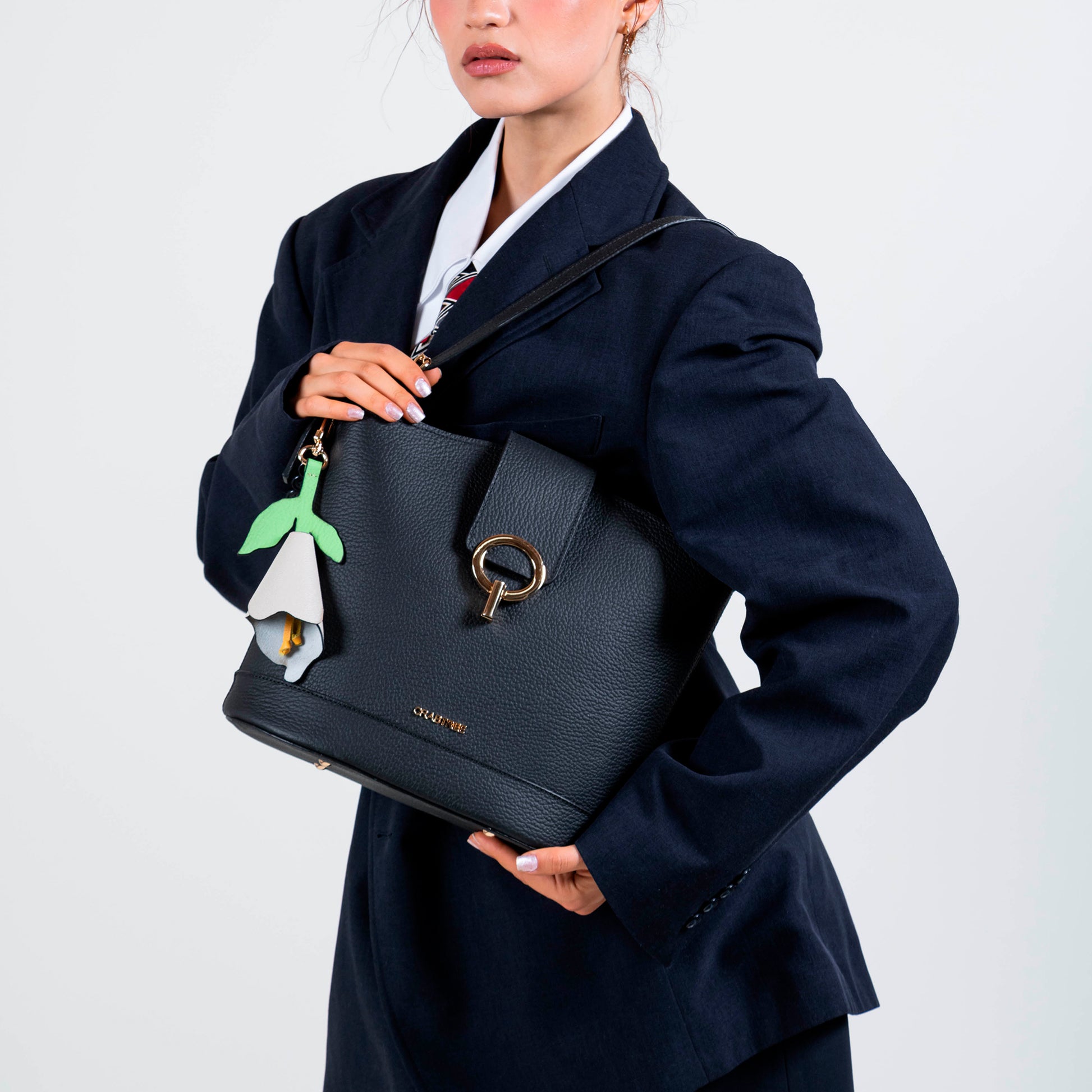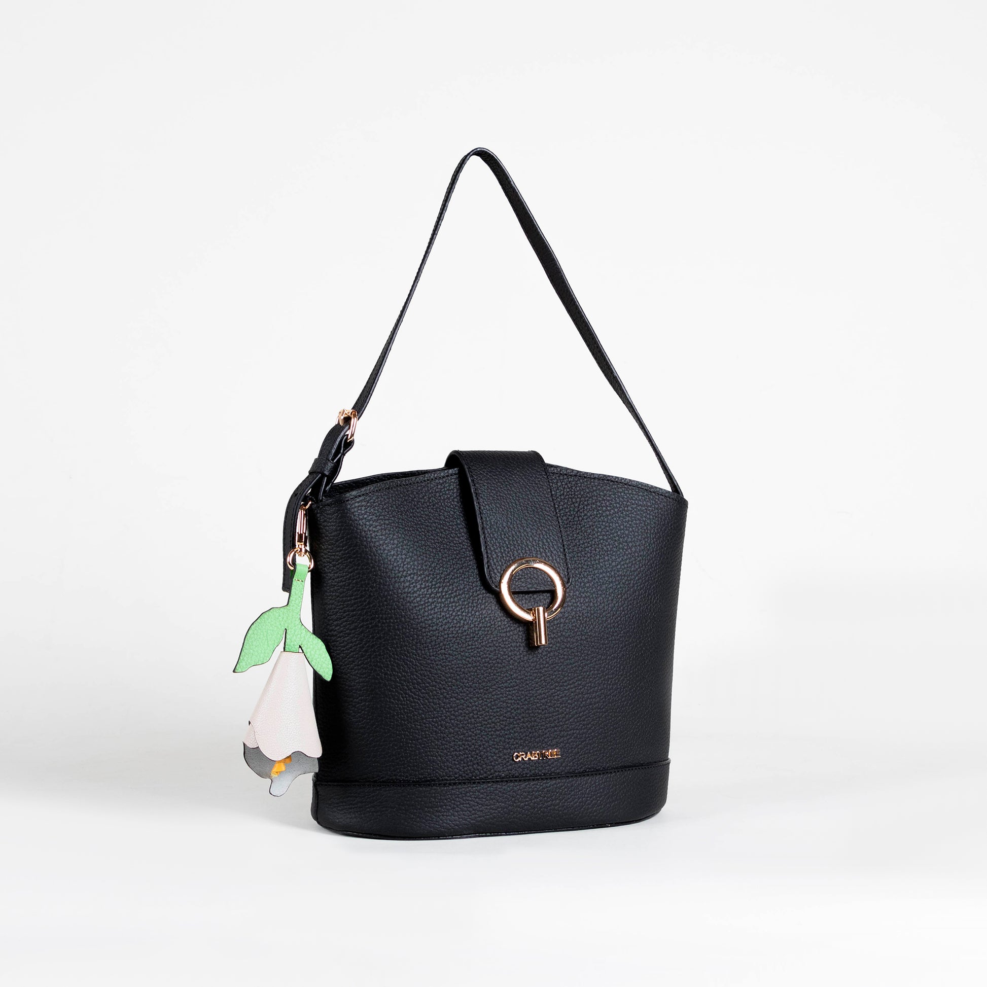 Detalle de charm en forma de flor a un costado.