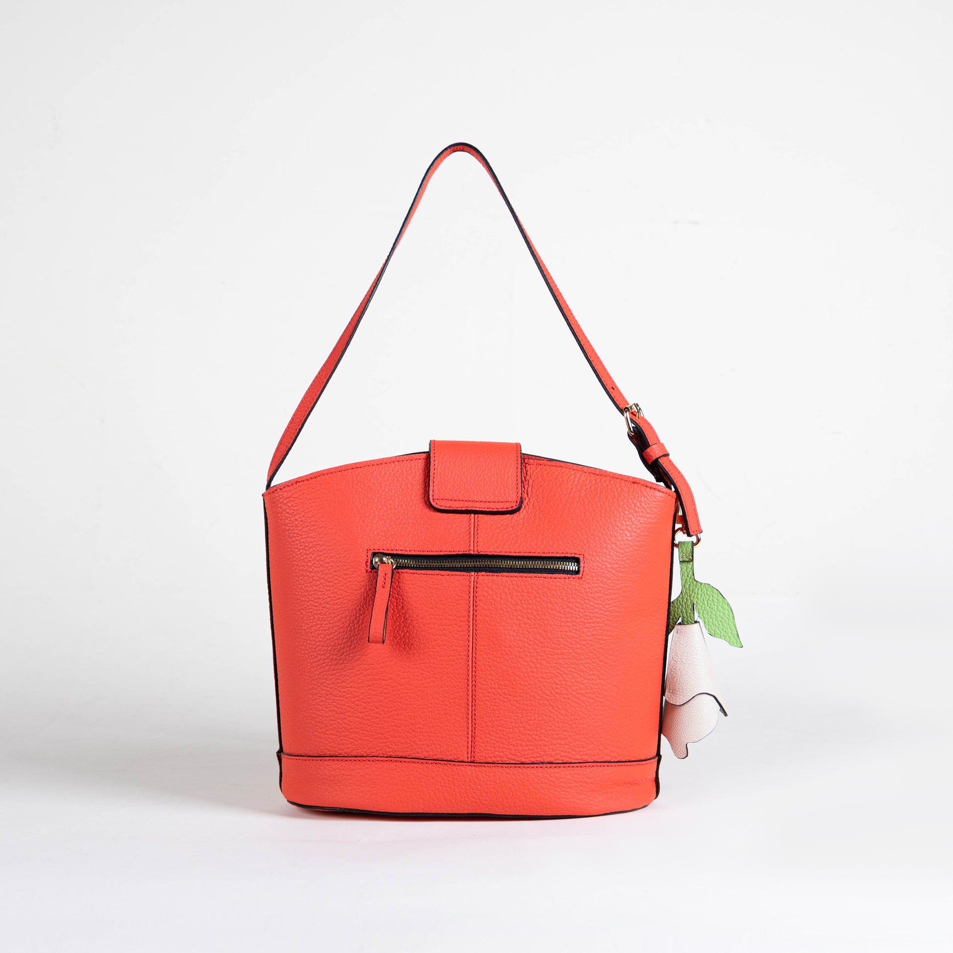 Bolso al hombro de una asa con tapa pequeña y cierre en la parte posterior.