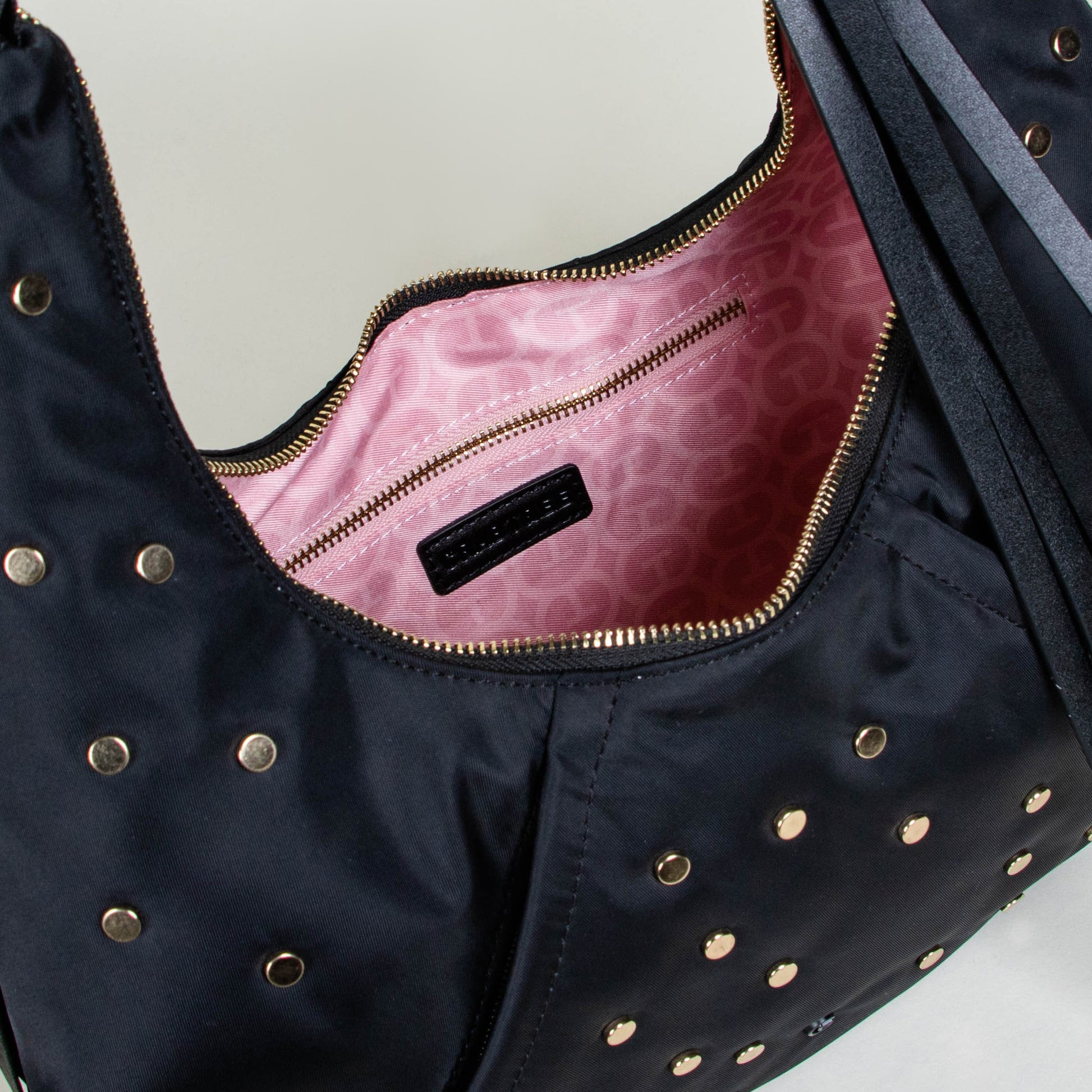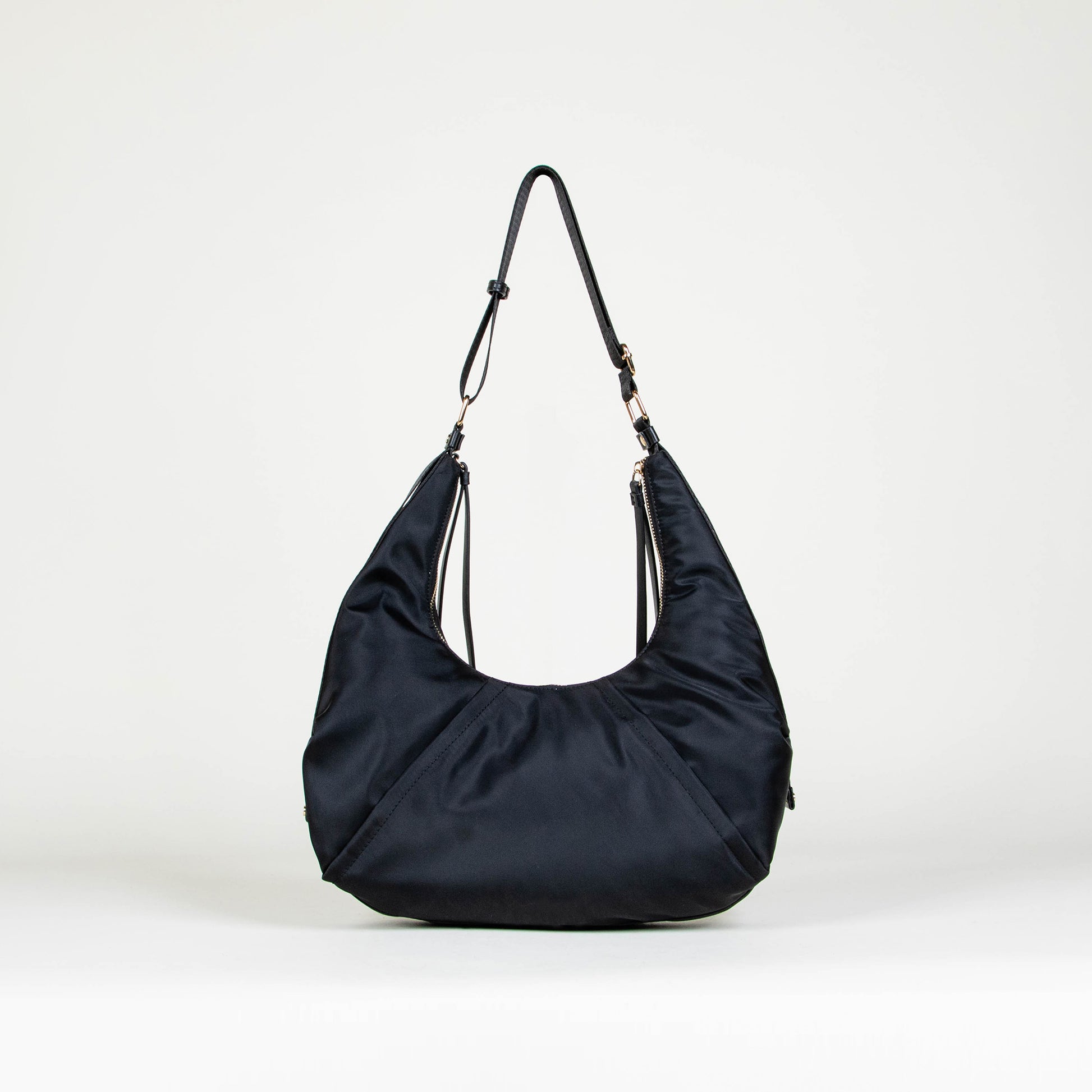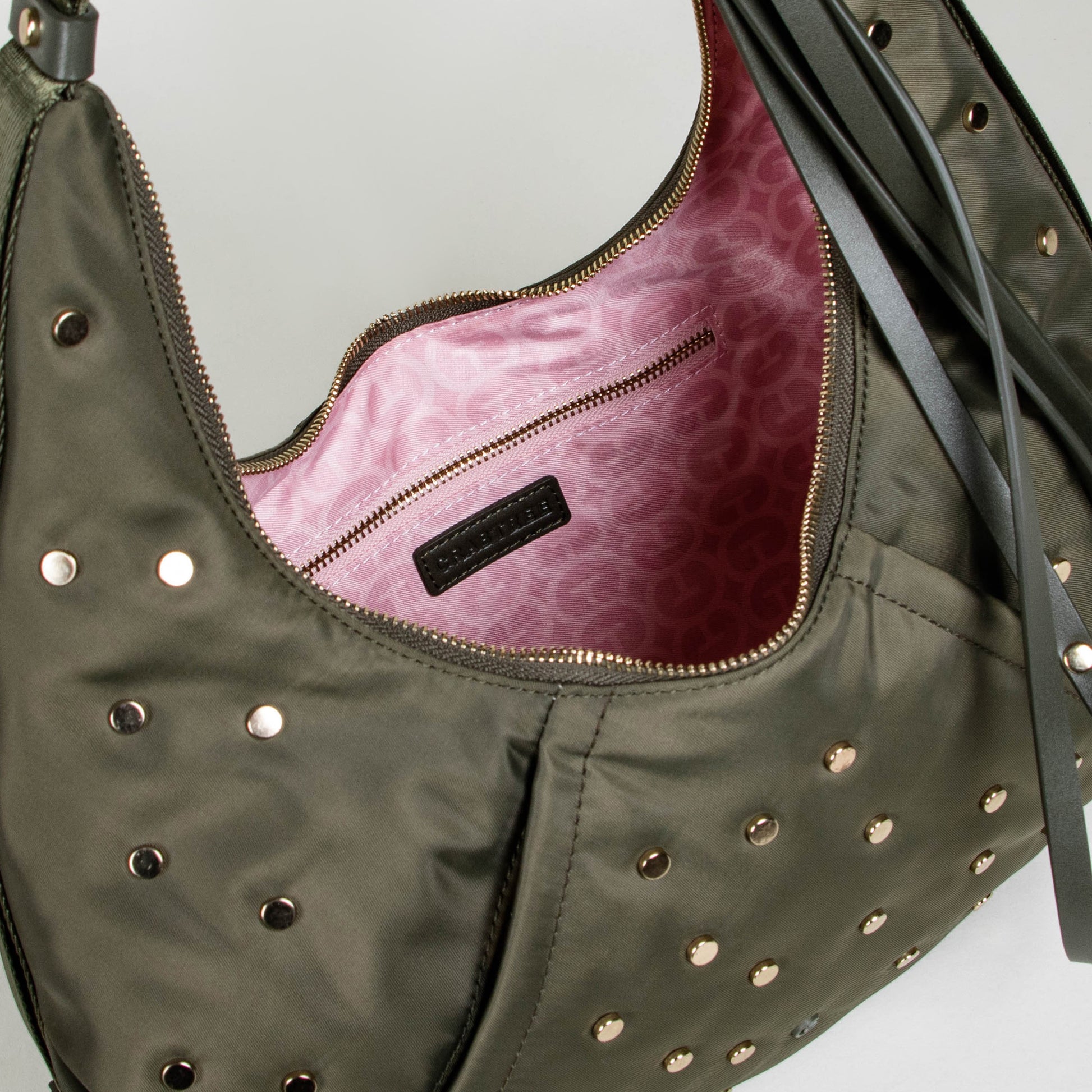 Bolso de silueta media luna en tono olivo y negro, confeccionado en material ligero con acabado suave y detalles metálicos que aportan un toque moderno y sofisticado.