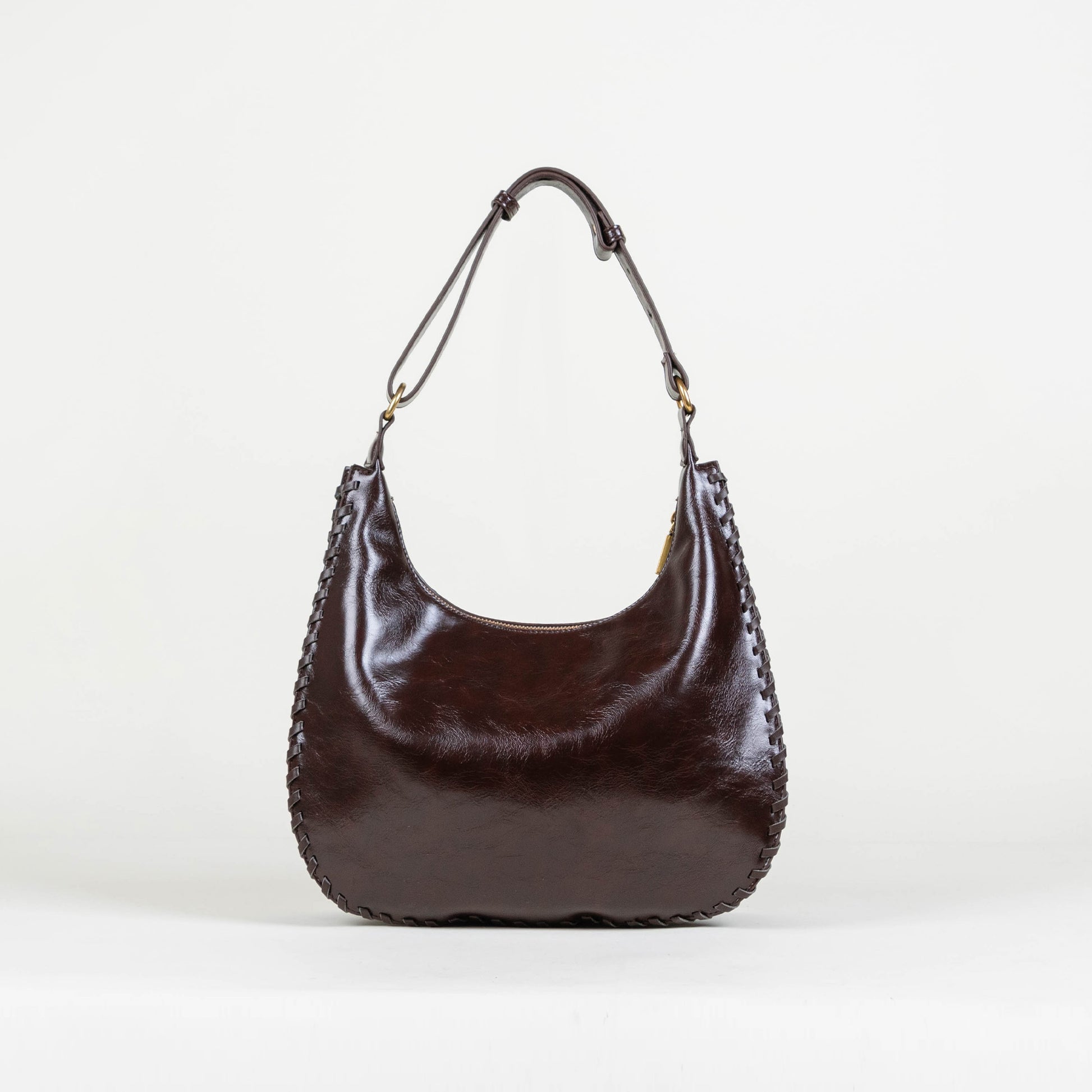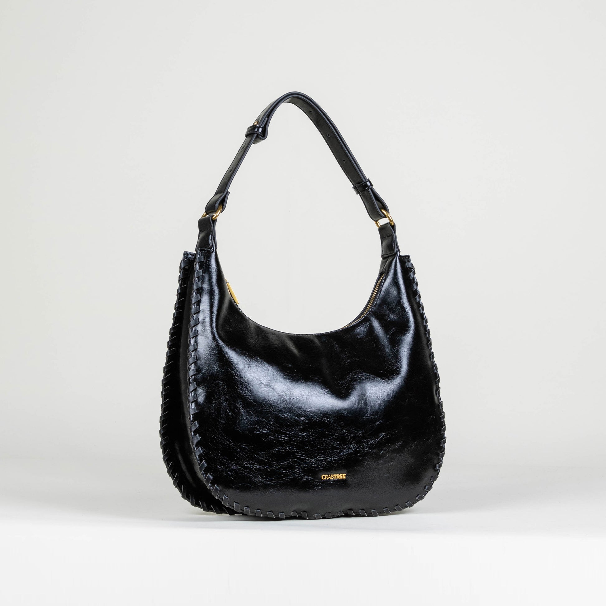 Este bolso shoulder en acabado negro brillante destaca por su silueta suave y contemporánea. Su diseño con costuras artesanales en los bordes aporta un detalle distintivo que equilibra lo clásico con lo moderno. Cómodo de llevar y con el espacio ideal para acompañarte durante el día, combina funcionalidad y elegancia en una pieza que eleva cualquier look con un estilo sofisticado y atemporal.