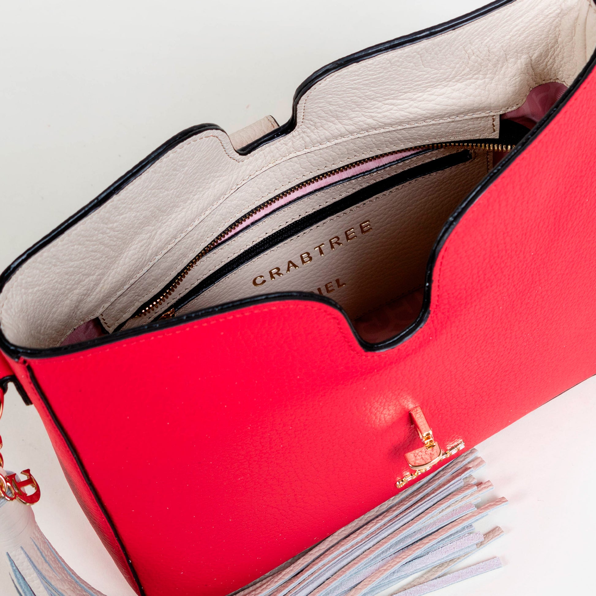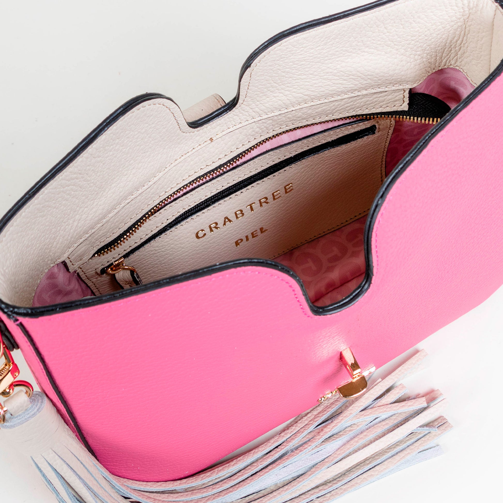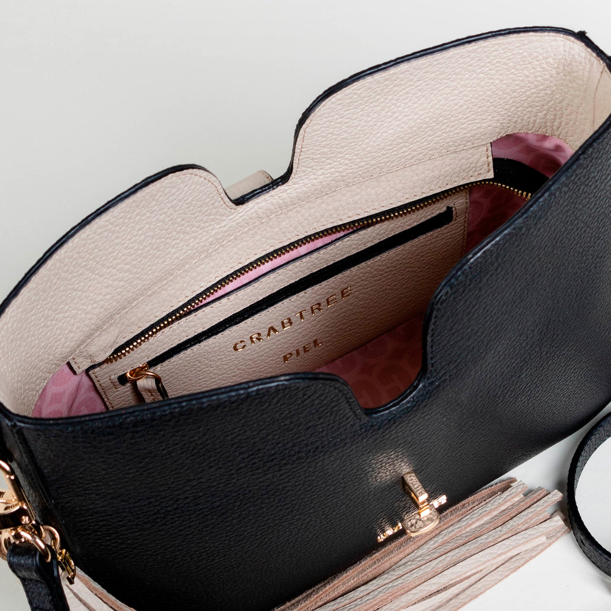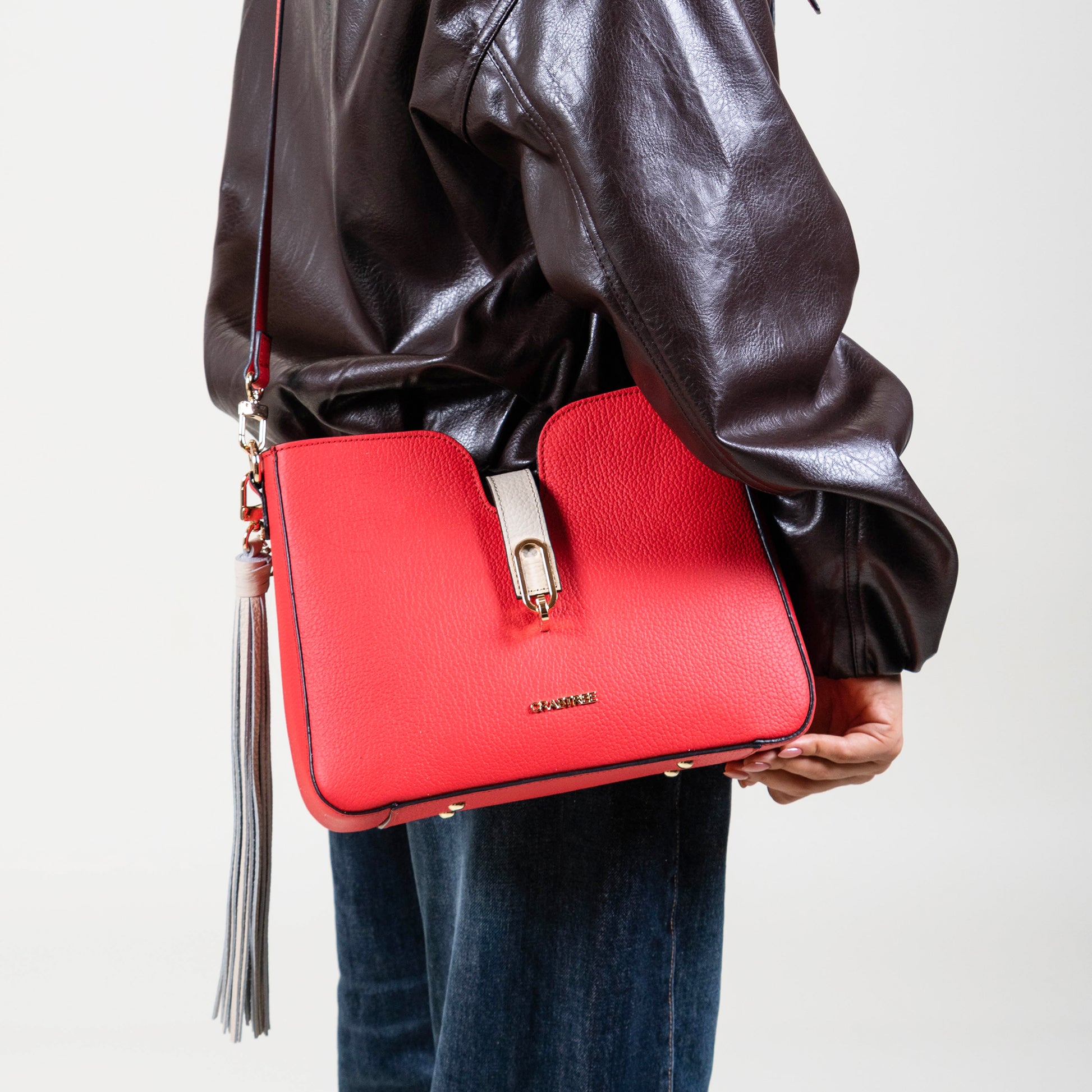 Bolso tote pequeño de piel con un broche en el centro y un pequeño compartimento en la parte de atrás.